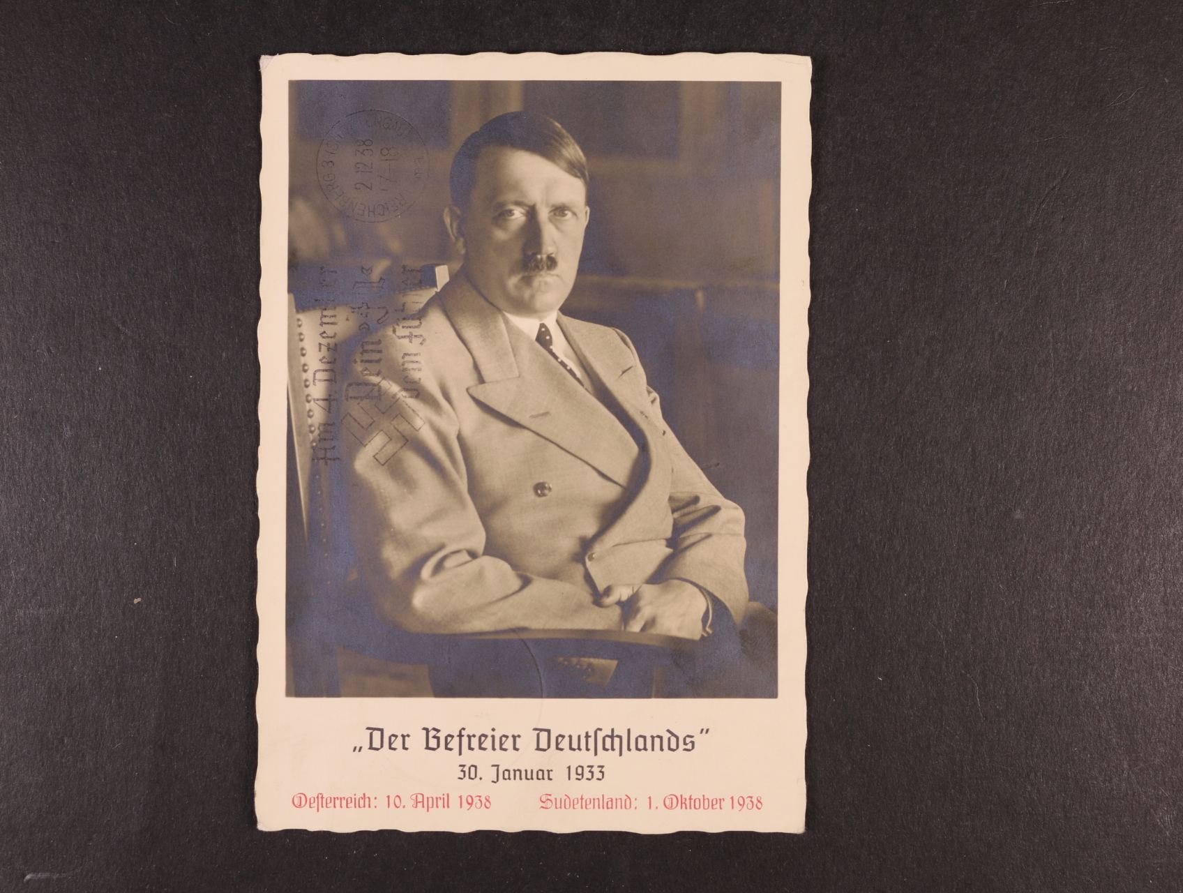 fotopohlednice s portrétem A.H. a červeným přítiskem Oesterreich: 10. April 1938 Sudetenland: 1. Oktober 1938, přepr. zeppelin. letem Sudetenland 1.12.38, velmi dobrá kvalita