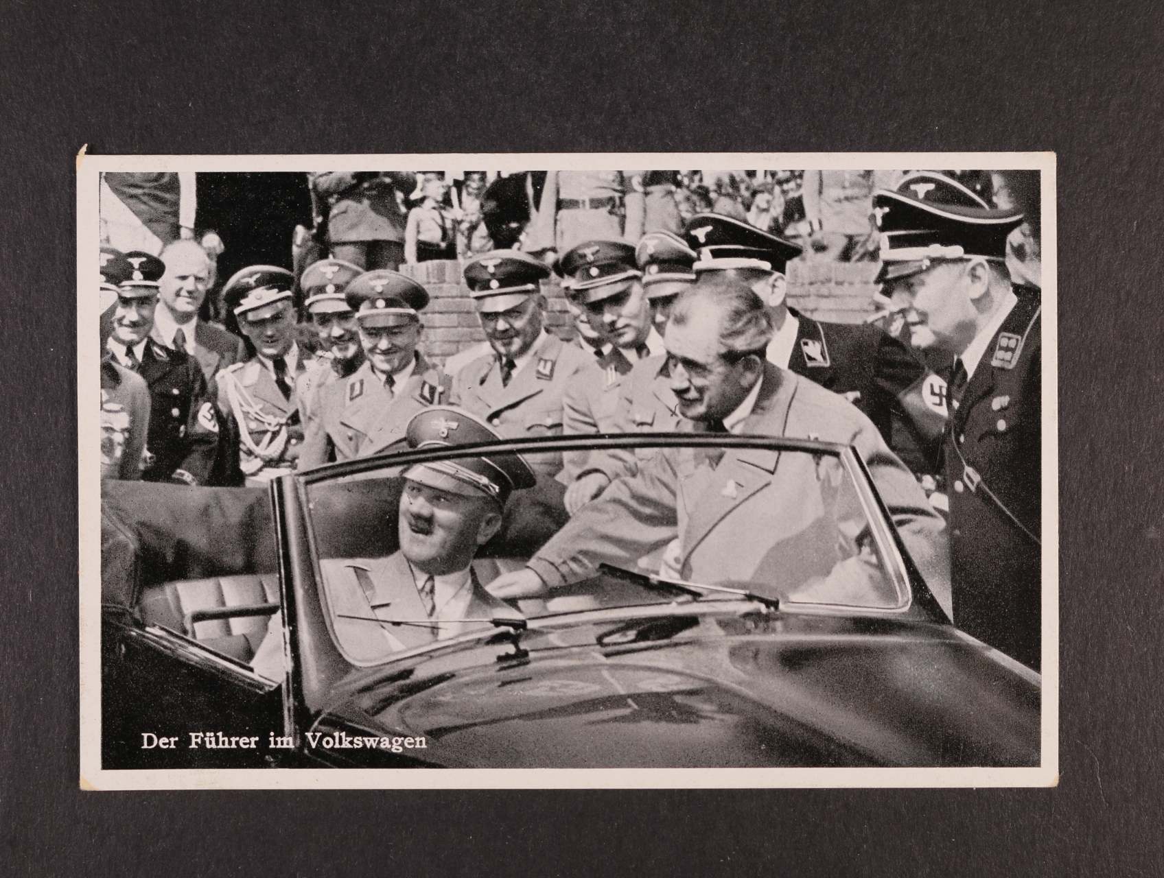 jednobar. fotopohlednice "Der Führer im Volkswagen", nepoužitá s pam. raz. BERLIN UNSER FÜHRER BANNT DEN BOLSCHEWISMUS 20.4.43