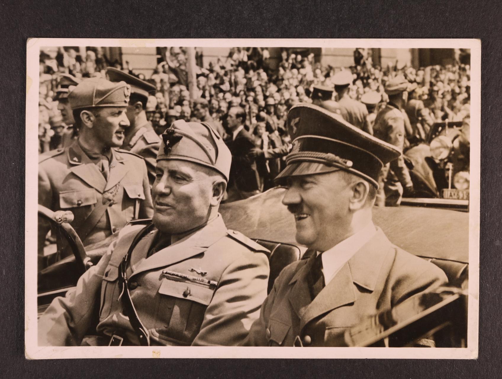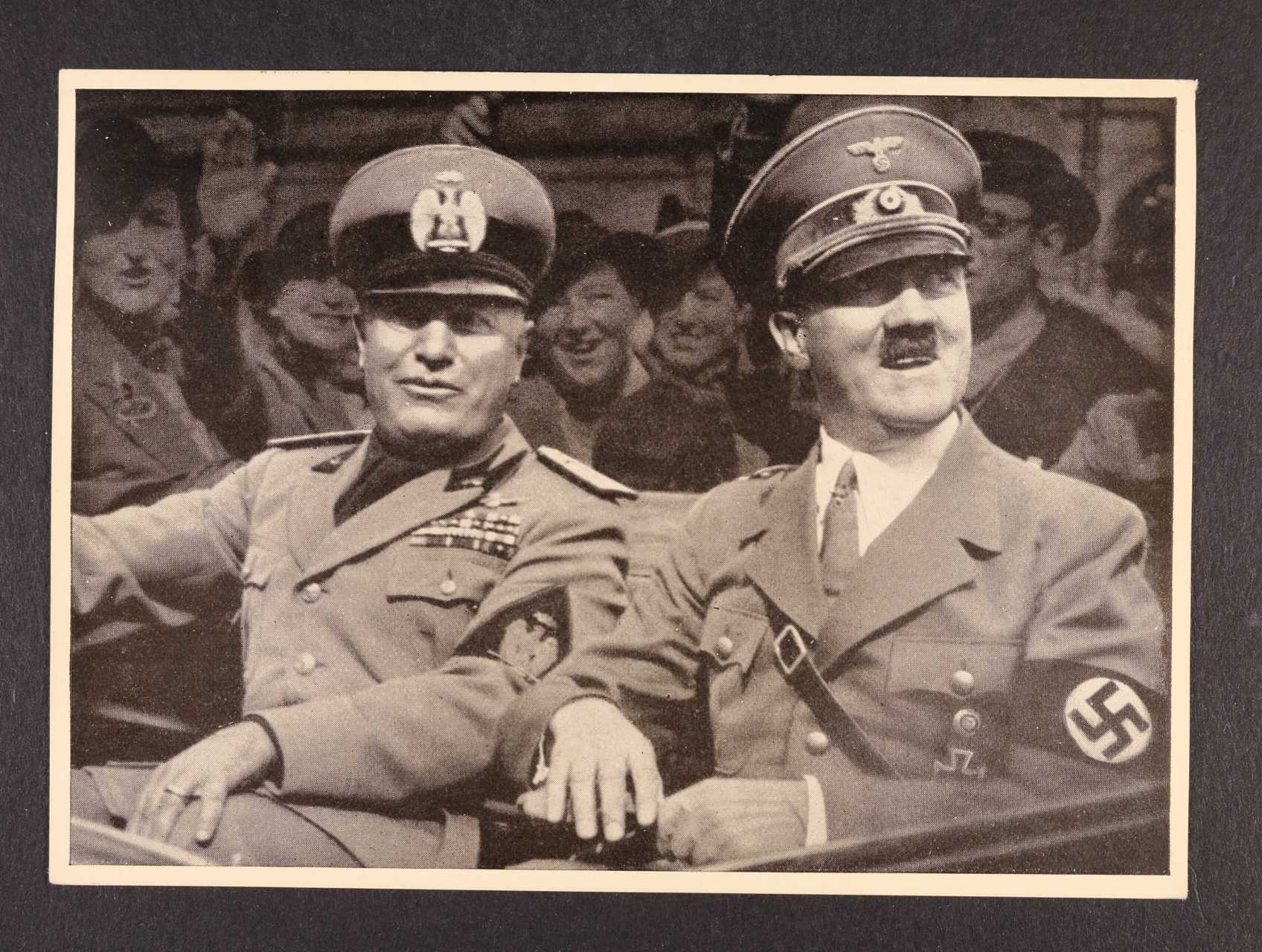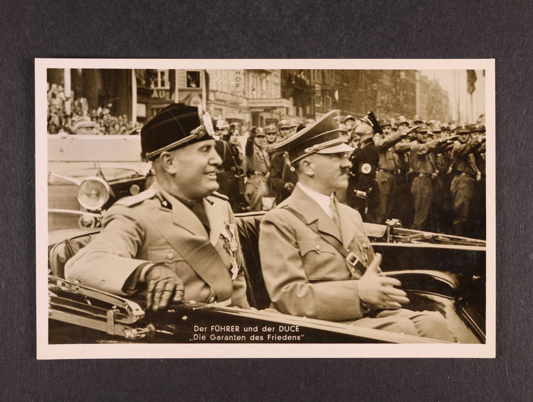 jednobar. fotopohlednice "Der Führer und der Duce, die Garanten des Friedens", nepoužitá, na zadní str. pam. raz., zajímavé