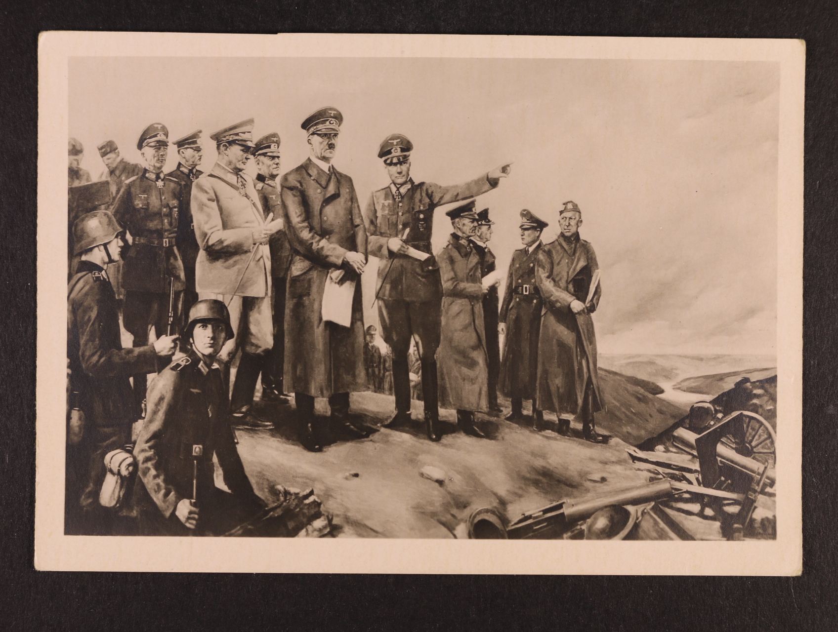 jednobar. fotopohlednice A. H. se skupinou generálů na bitevním poli