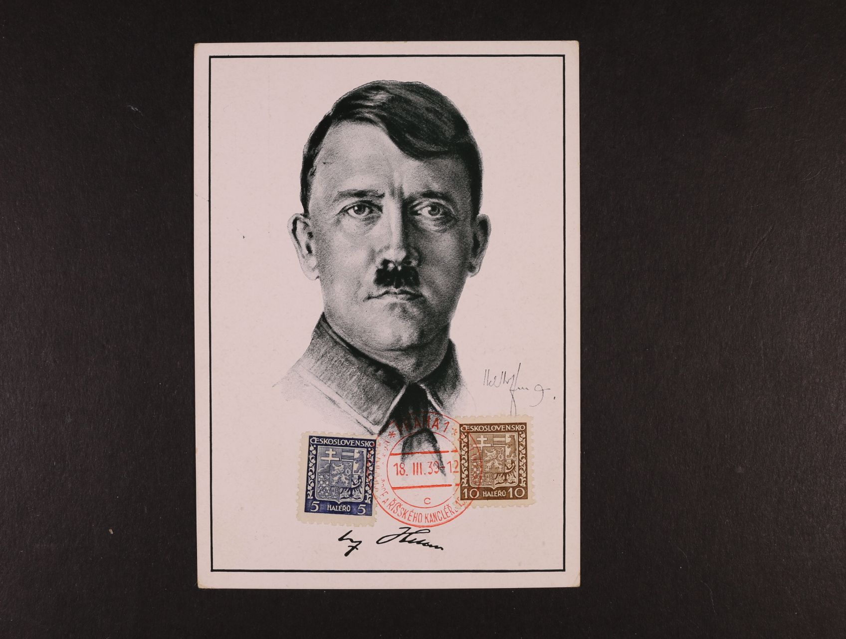 jednobar. pohlednice s portrétem A. H. , nepoužitá se známkami "znak" a červeným pam. raz.