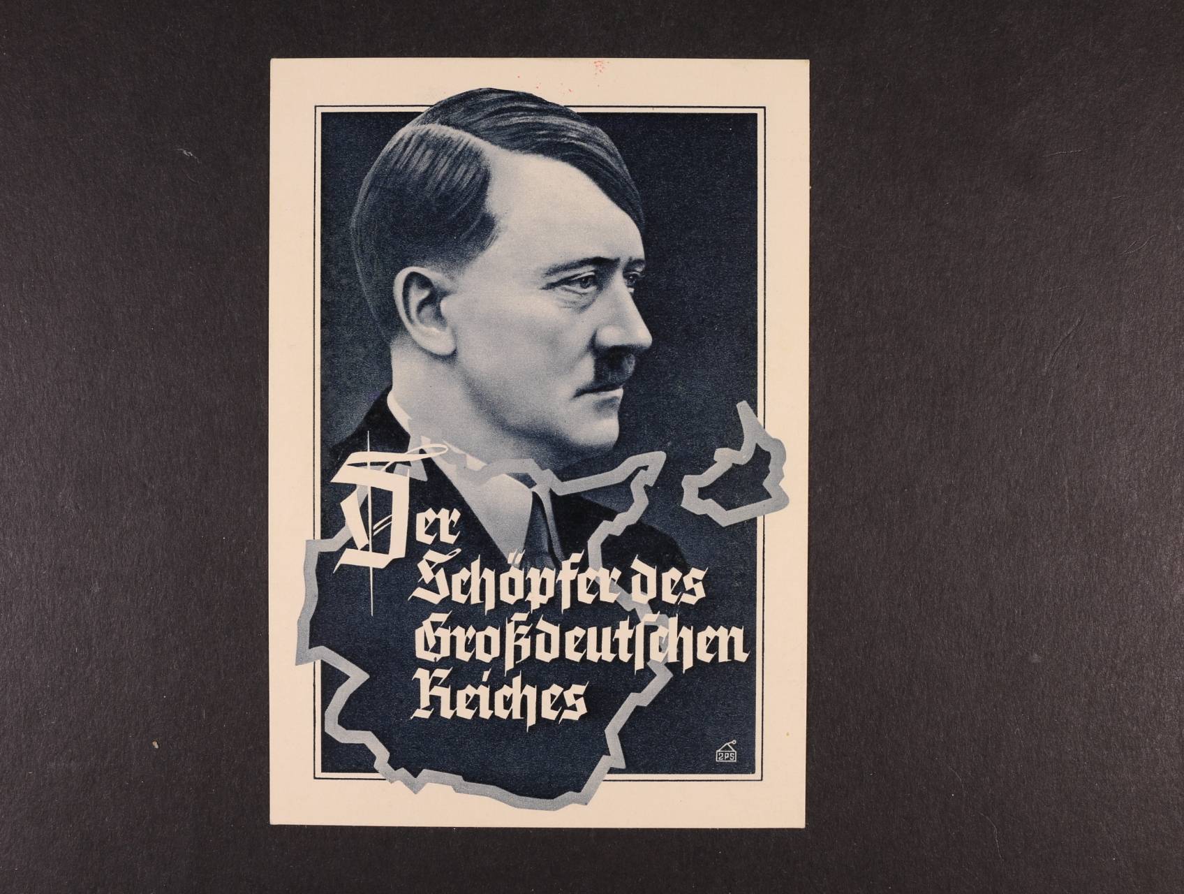 jednobar. pohlednice s portrétem A.H. "Der Schöpfer des Grossdeutschen Reichs", nepoužitá s pam. raz., lux. kvalita