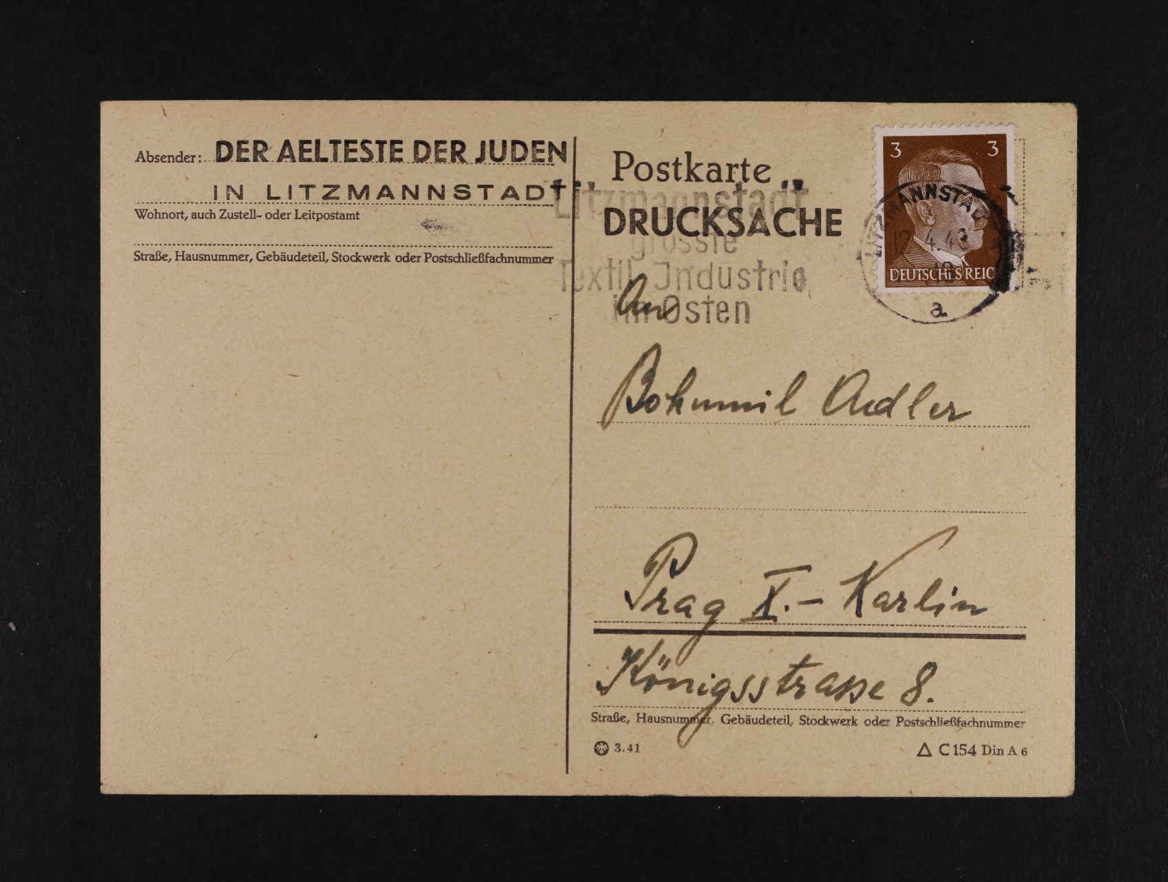 Litzmannstadt - oficielní předtištěný KL do Prahy frank. zn. 3pf A.H., pod. raz. LITZMANNSTADT 12.4.43