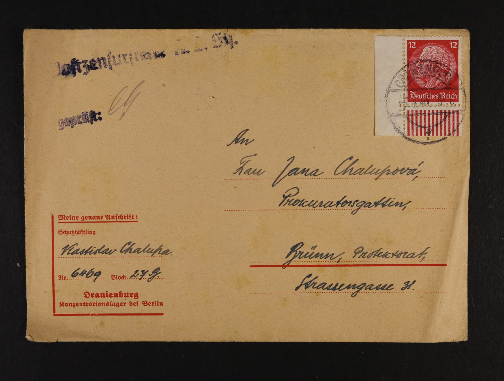 Oranienburg - předtištěná obálka do Brna frank. zn. 12pf Hindenburg, pod. raz ORANIENBURG 3.4.40 + řádkové cenzurní raz.