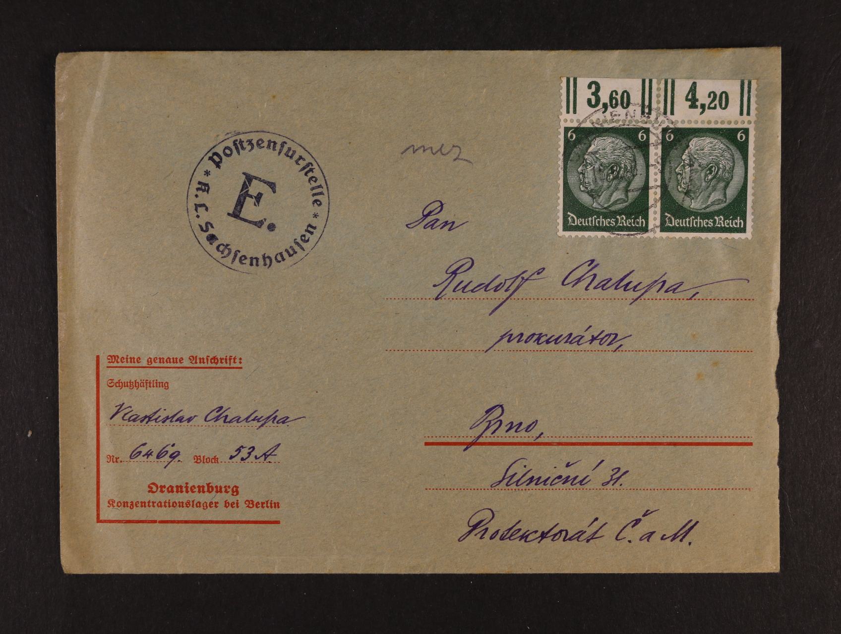 Oranienburg - úřední obálka do Brna frank. dvoupáskou 6pf Hindenburg, pod. raz. ORANIENBURG, cenzurní raz. E. K.L. Sachsenhausen