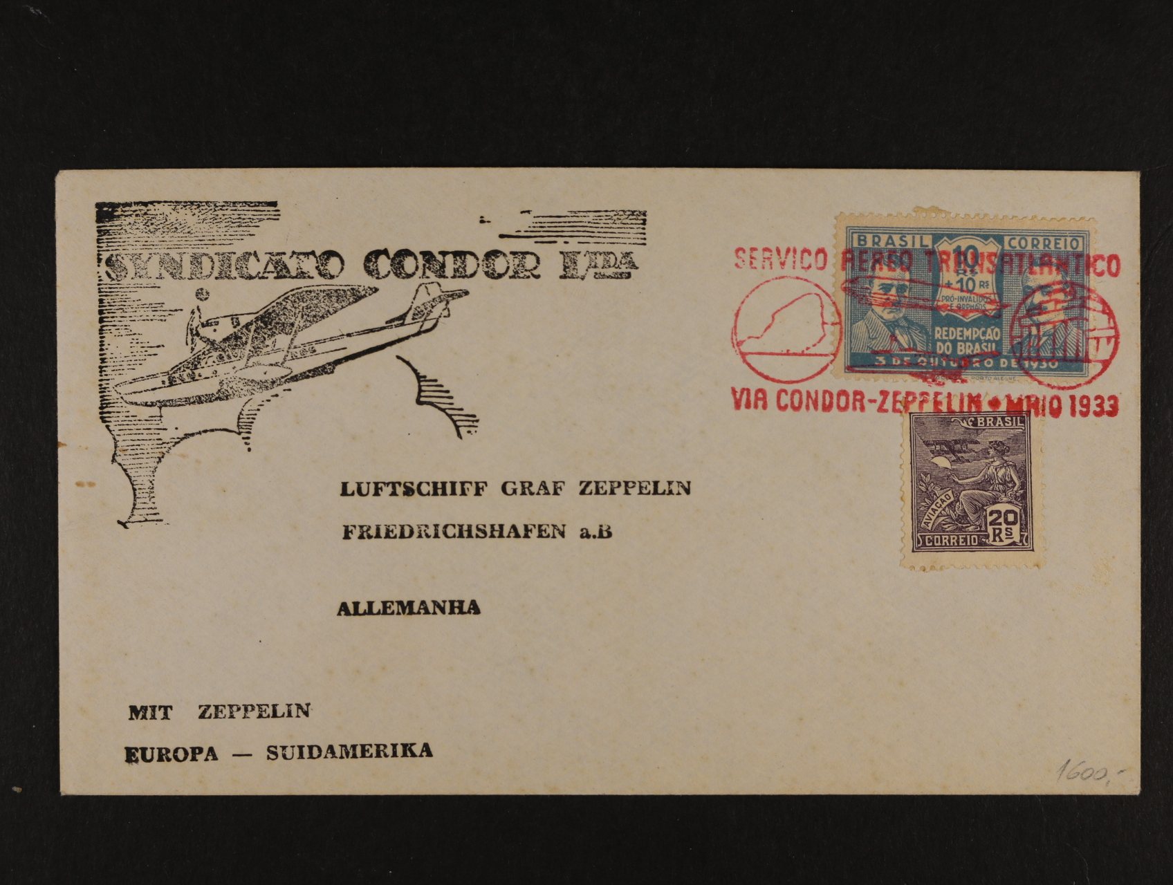 922 Brazílie - dopis do Německa frank. zn. Mi. č. 297, 338 s červeným pod. raz. VIA CONDOR - ZEPPELIN 1933 + černý let. kašet SINDICATO CONDOR, dobrá kvalita 700