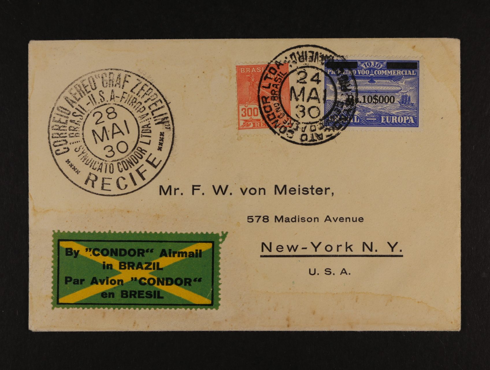923 Brazílie - dopis do USA frank. zn. Mi. č. 300 + vydání pro privátní let. spol. Mi. Zp č. 10, pod. raz. SINDICATO CONDOR LTDA 24.5.30, průch. raz., zelené přích. raz. LAKEHURST 1500