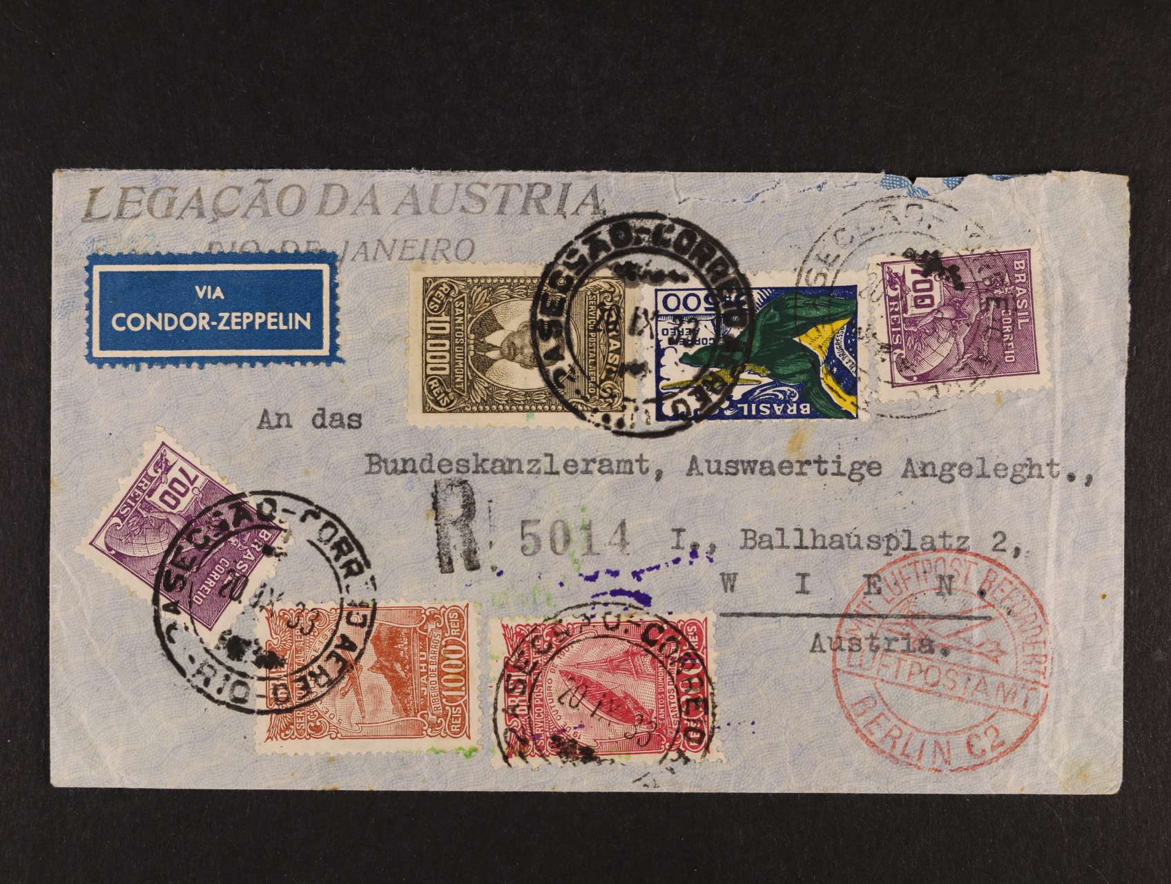 924 Brazílie - R-celistvost do Vídně přepr. zeppelin. letem, pod. raz. SECEAO - CORREIO AERO - RIO 20.9.33, průch. červené raz. BERLIN C 2, na zadní str. průch,. raz., fialový zeppelin. kašet, zelené přích. raz. FRIEDRICHSHAFEN 300