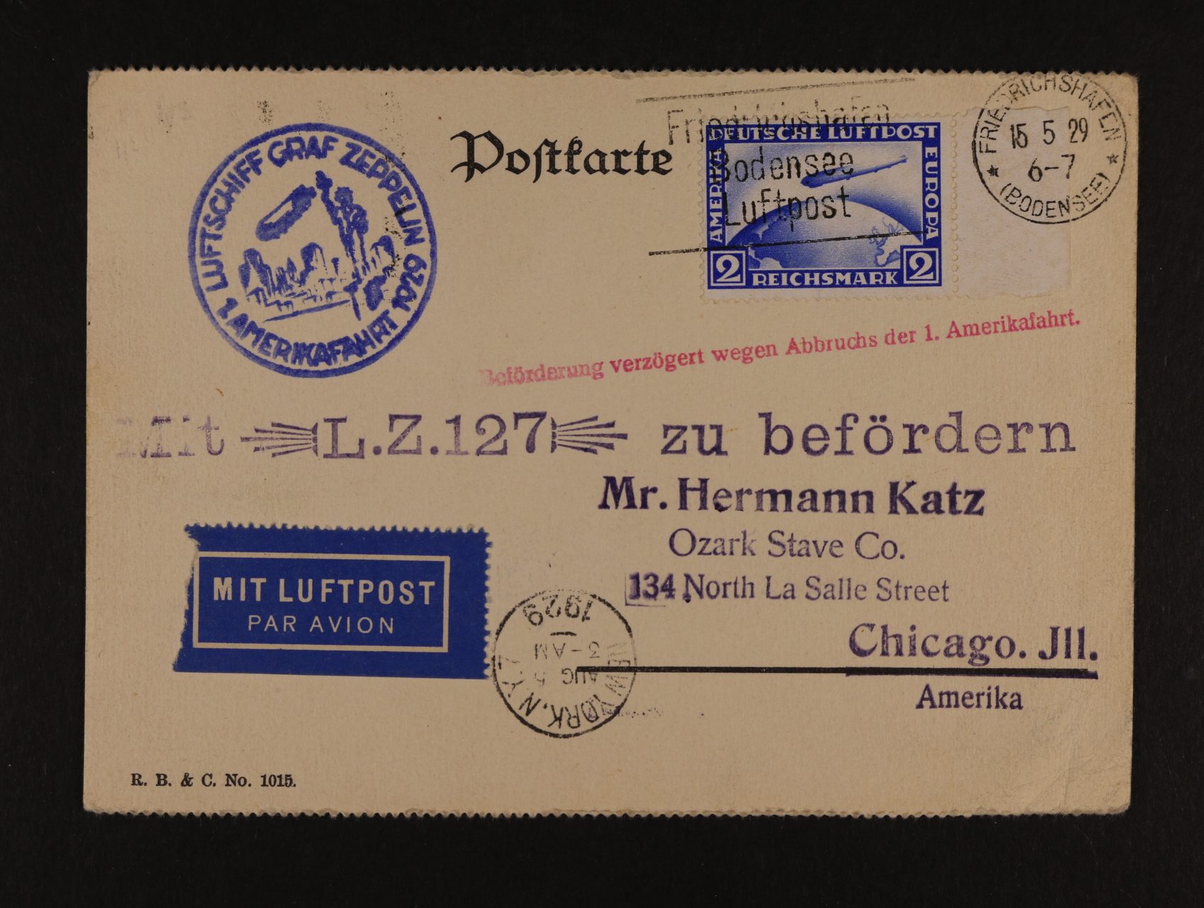 925 Německo - celistvost do USA přepr. 1. letem Amerikafahrt 1929, pod. raz. FRIEDRICHSHAFEN 15.5.29 + modrý let. kašet a přích. raz., velmi dobrá kvalita 1000