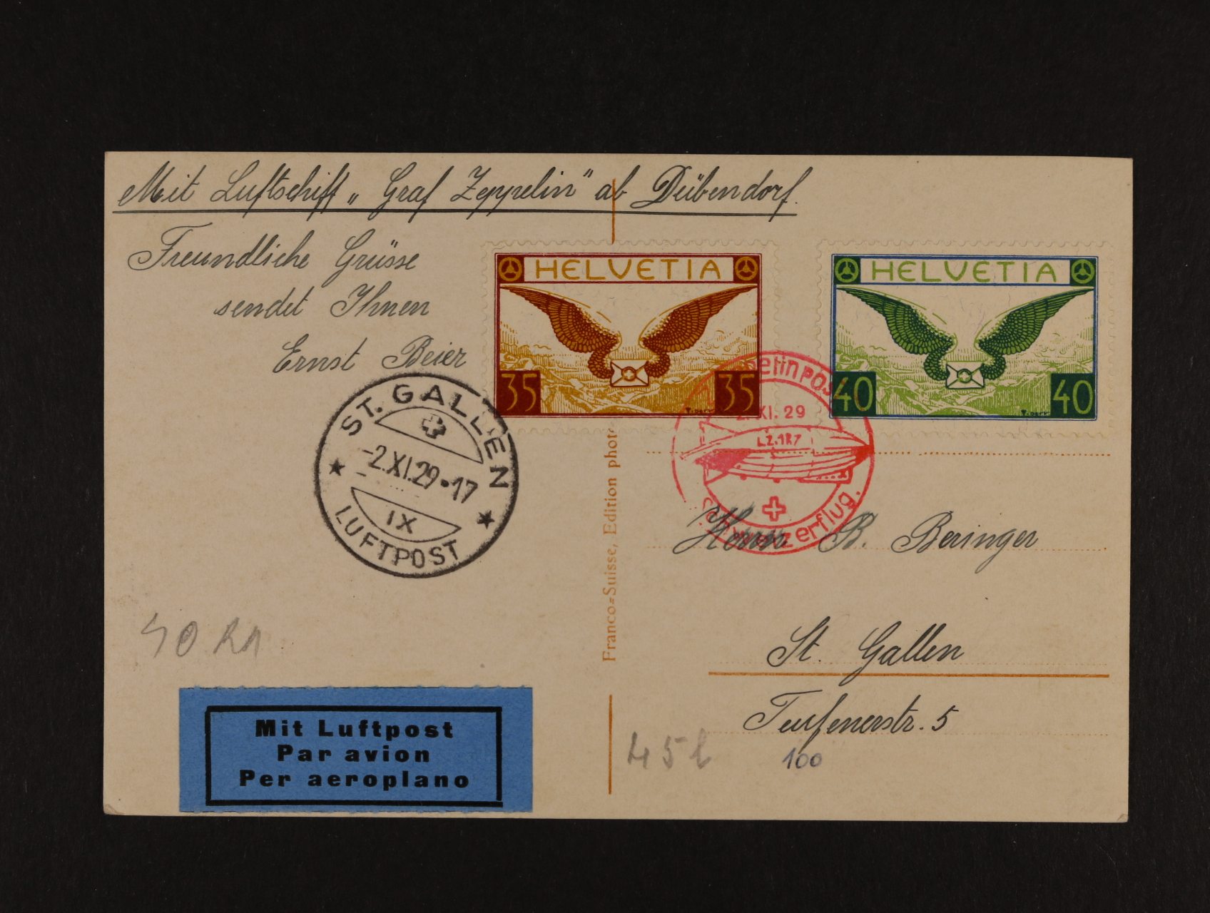 926 Švýcarsko - jednobar. fotopohlednice B 841 Luftschiff "Garaf Zeppelin" frank. zn. Mi. č. 233, 234, pod. červené raz. Zeppelinpost Schweizerflug 2.11.29 + přích. raz., lux. kvalita 1500