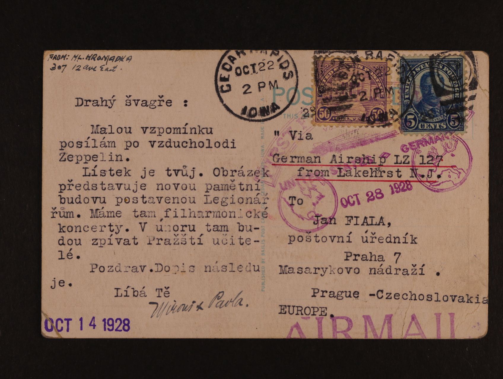 927 USA - celistvost do ČSR přepr. zeppelin. 1.letem USA - Evropa, pod. raz. CEDAR RAPIDS OCT.22.1928 + fialový let. kašet 300