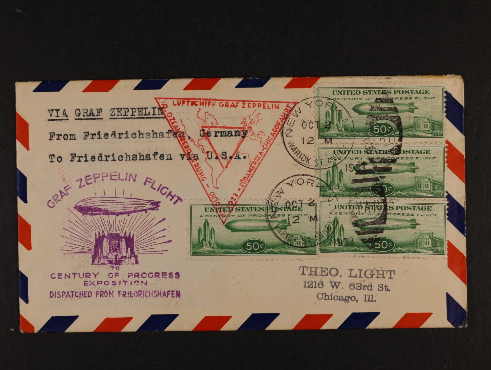 928 USA - celistvost přepr. zepp. letem S.A.F. - Chicagofahrt frank. zn. Mi. č. 358 (4x), pod. raz. NEW YORK 2.OCT.1933 + trojúhelníkový červený a fialový let. kašet 3200