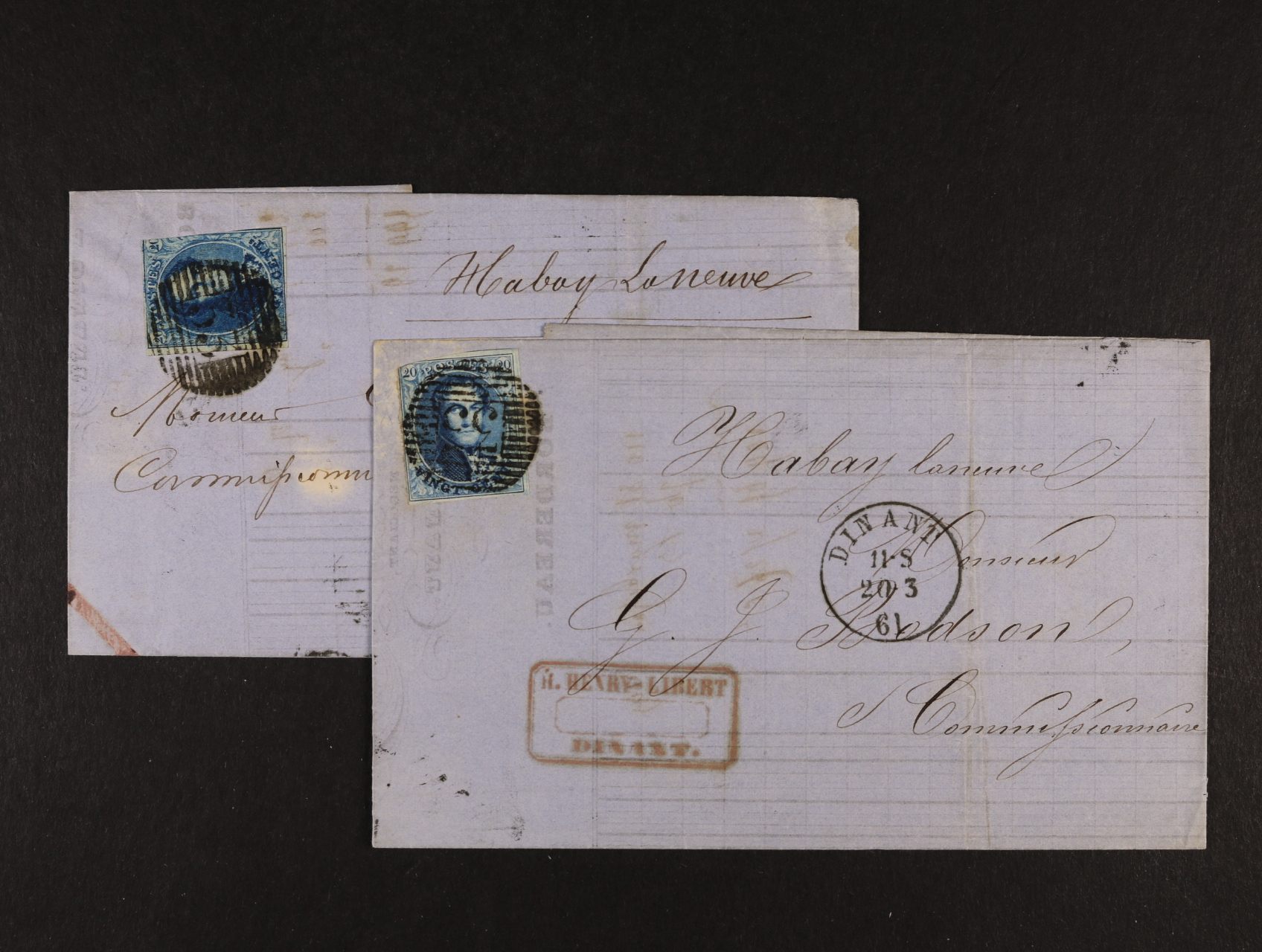 930 dva skl. dopisy z r. 1861 frank. zn. 20cent, znehodnoc. čís. raz. 33 a denním pod. raz. DINANT 20.3.61, resp. 24.6.61 + červené a modré firemní raz., dobrá kvalita 400