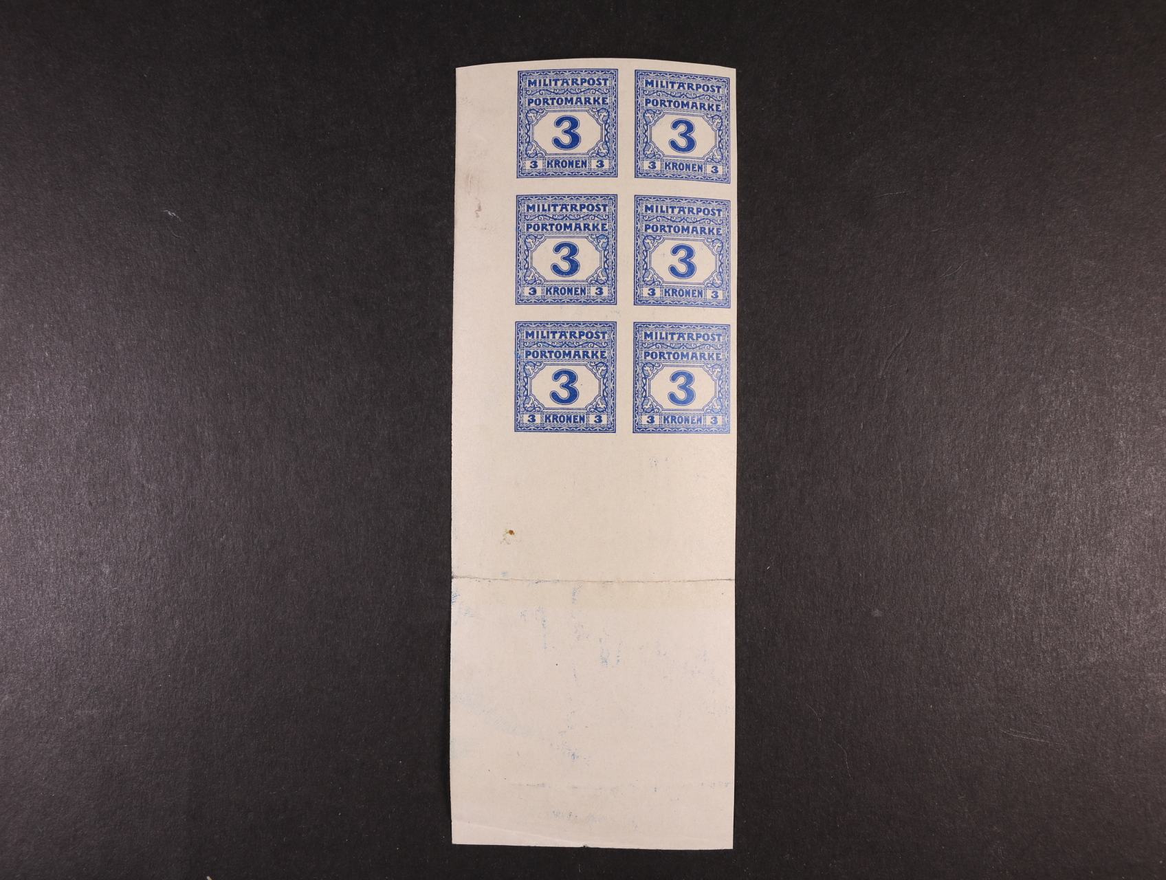 938 doplatní zn. vydání 1916, 3K modrá, levý spodní roh. 6ti-blok nezoubkovaných ZT, s kompletním okrajem archu 10cm, unikátní blok, pochází z významného exponátu 9000