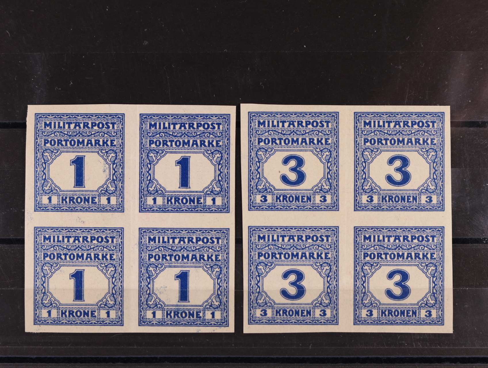 939 doplatní zn. vydání 1916, 1K a 3K modrá, 4-bloky nezoubkovaných ZT, Ferch.cca 1000 EUR 5000