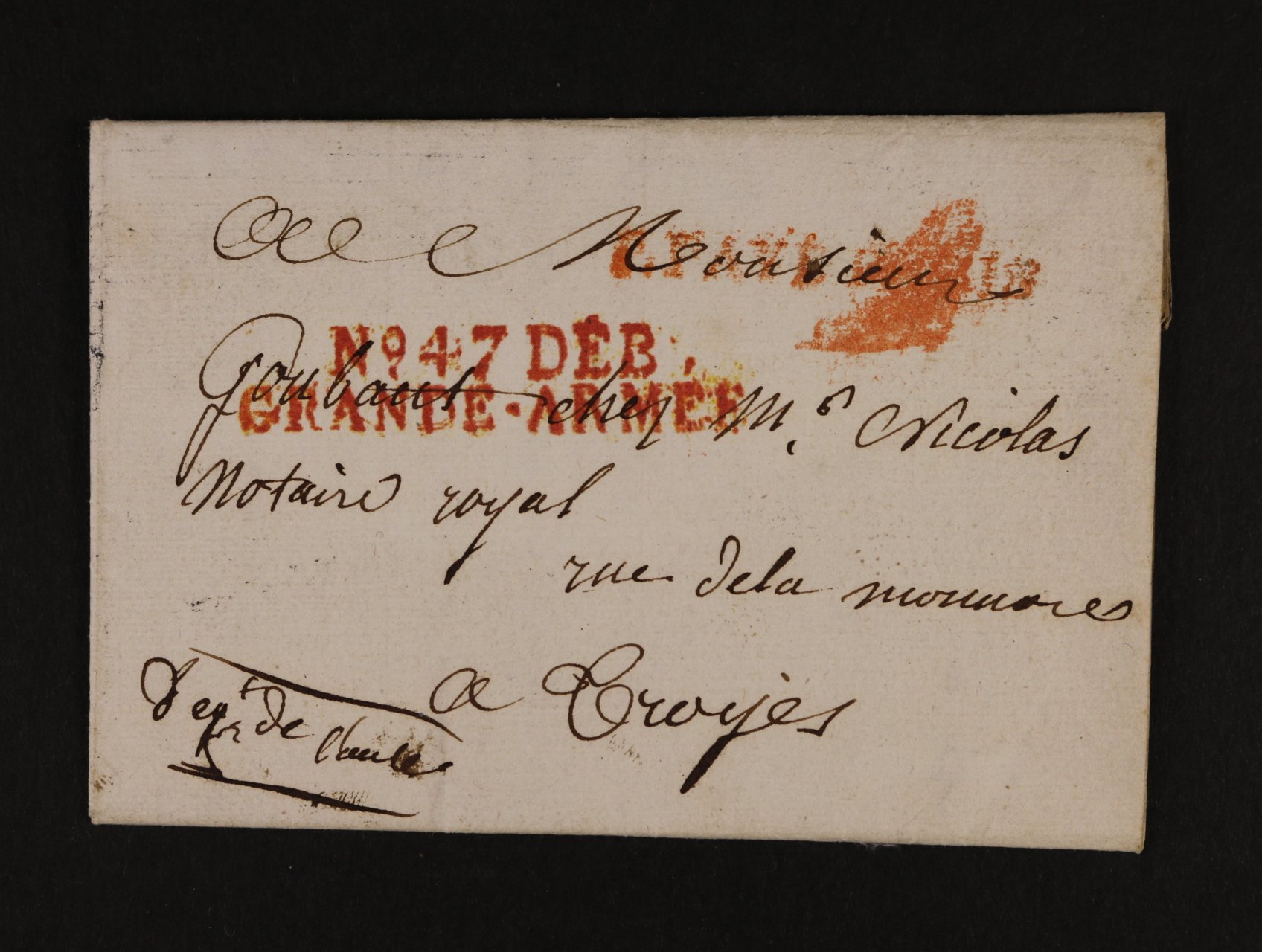 skl. vojenský dopis vč. obsahu z r. 1808 s červeným řádkovým raz. No. 47 DÉB GRANDE ARMÉE, na zadní str. dvoukruh. červené raz. FÉVRI .. 22.1808