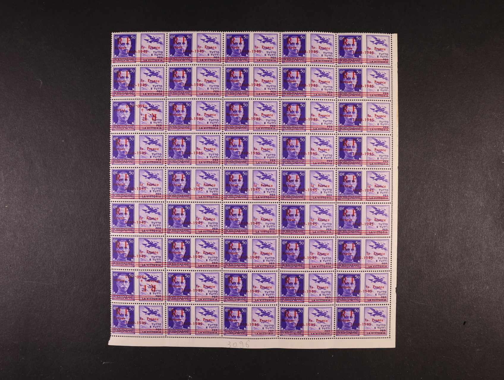 zn. Mi. č. 304 - 5 v 50ti-bloku s horním, pravým a spodním okrajem a 307 v 45ti-bloku s pravým a spodním okrajem s propag. kupony a přítiskem R. F. Retour á la France 1860 - 1945