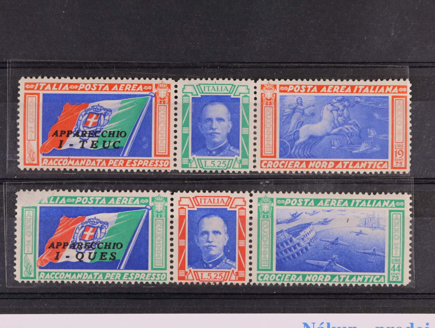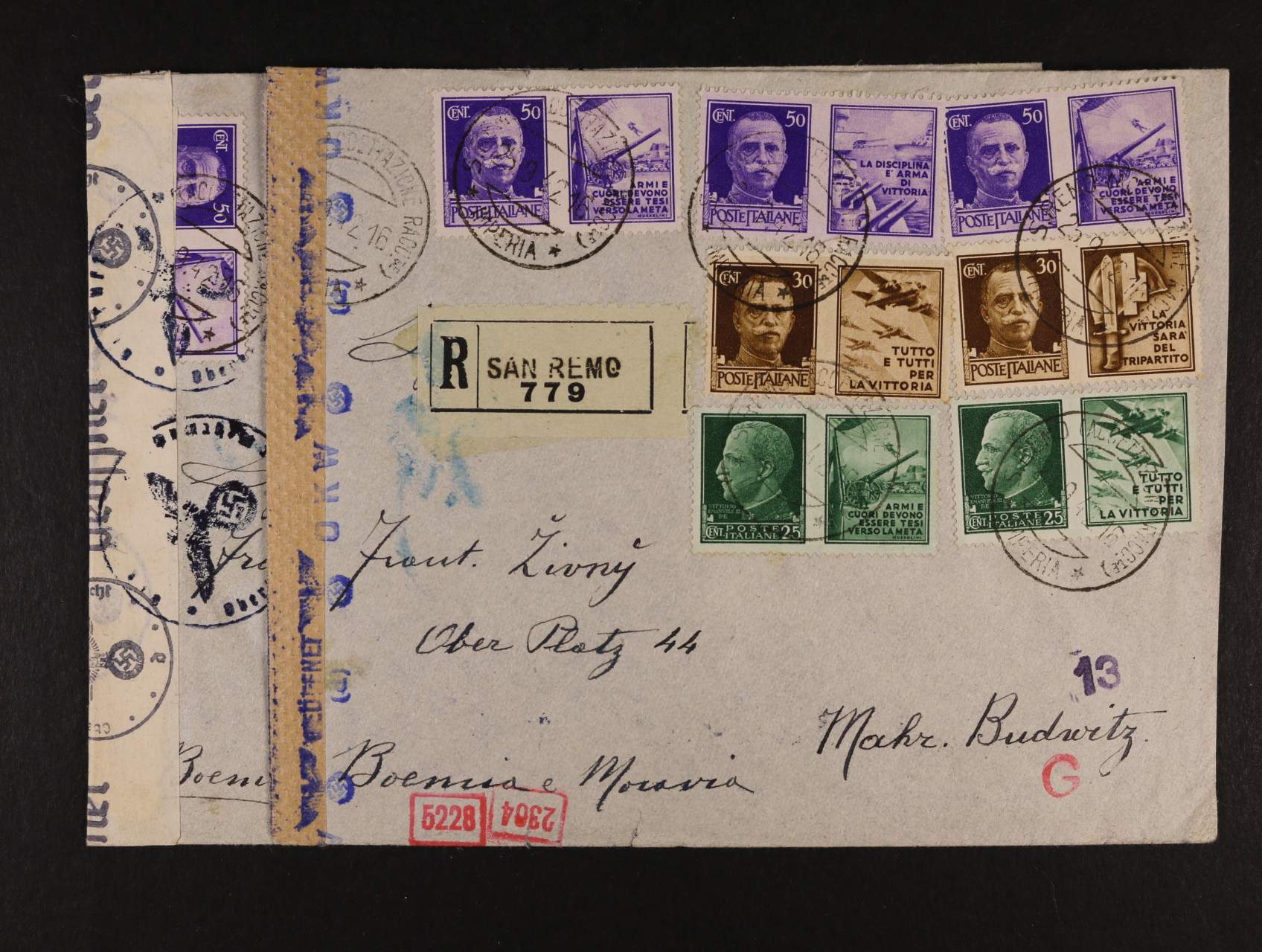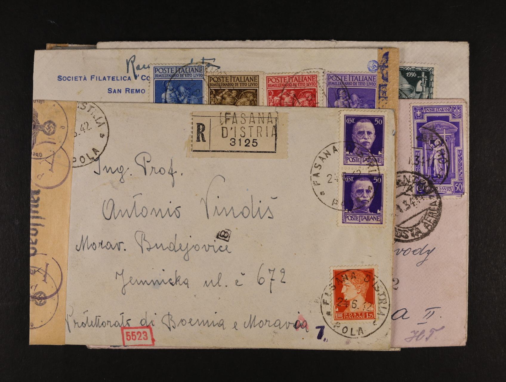 dva R-dopisy do Protektorátu frank. zn. Mi. č. 304, 305, 307 s kupony s válečnou propagandou, pod. raz. SAN REMO 25.9.42, cenzurní pásky a raz., velmi zajímavé