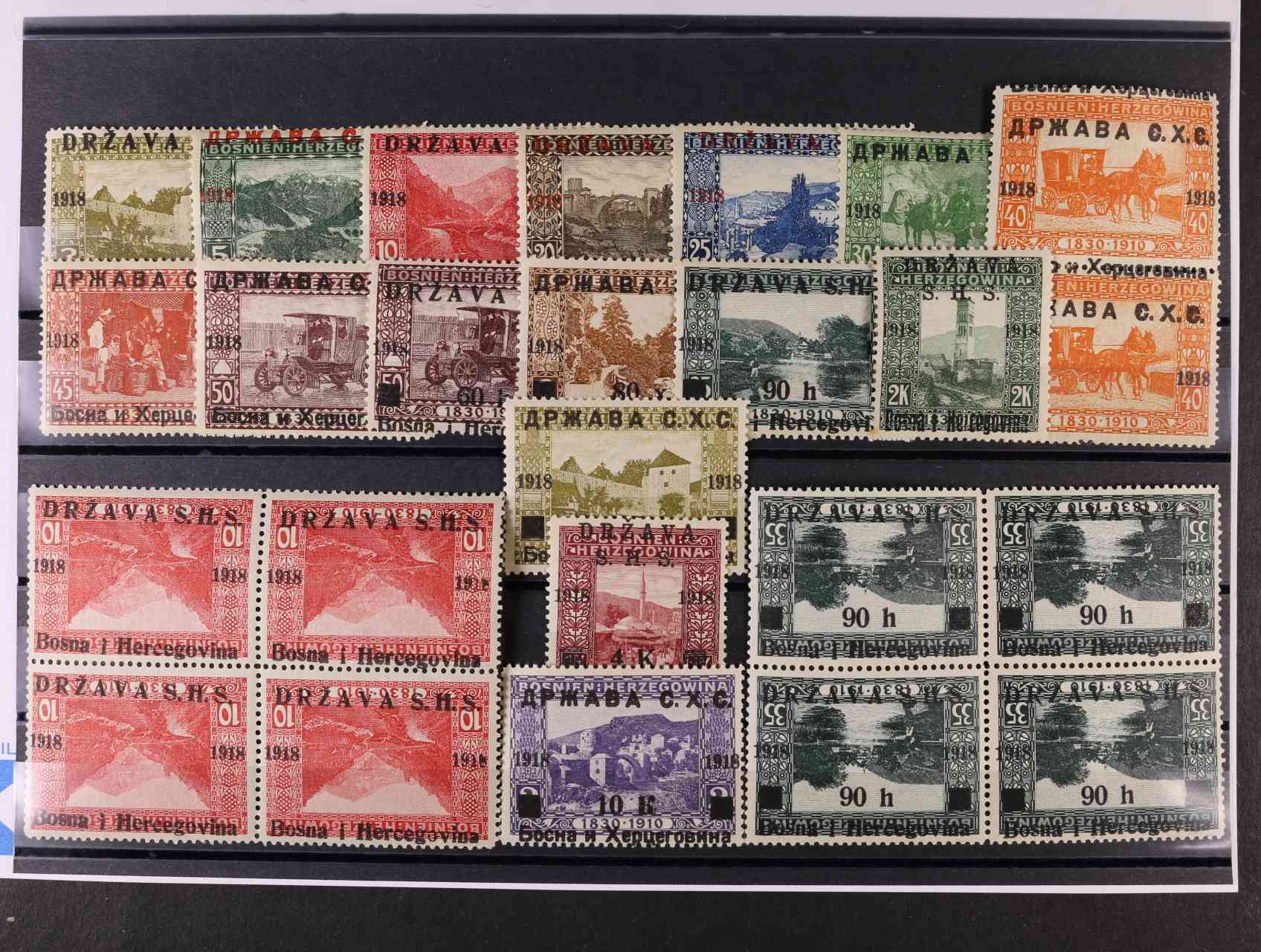 1021 vydání pro Bosnu zn. Mi. č. 1 - 16 s různými posuny přetisku + zn. Mi. 3 + 12 ve čtyřblocích s převráceným přetiskem 500