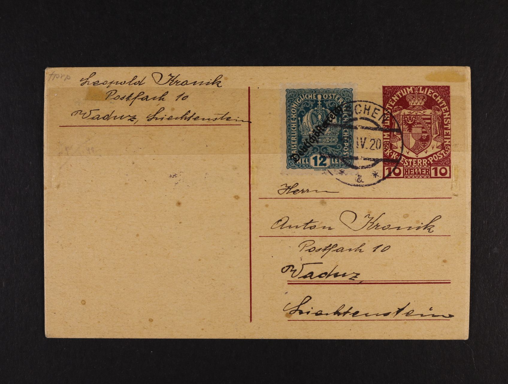 1022 KL Mi. P 1 dofrank. rak. zn. 12h cís. koruna s přetiskem Deutschesössterreich, pod. raz. ESCHEN 15.4.20 1800