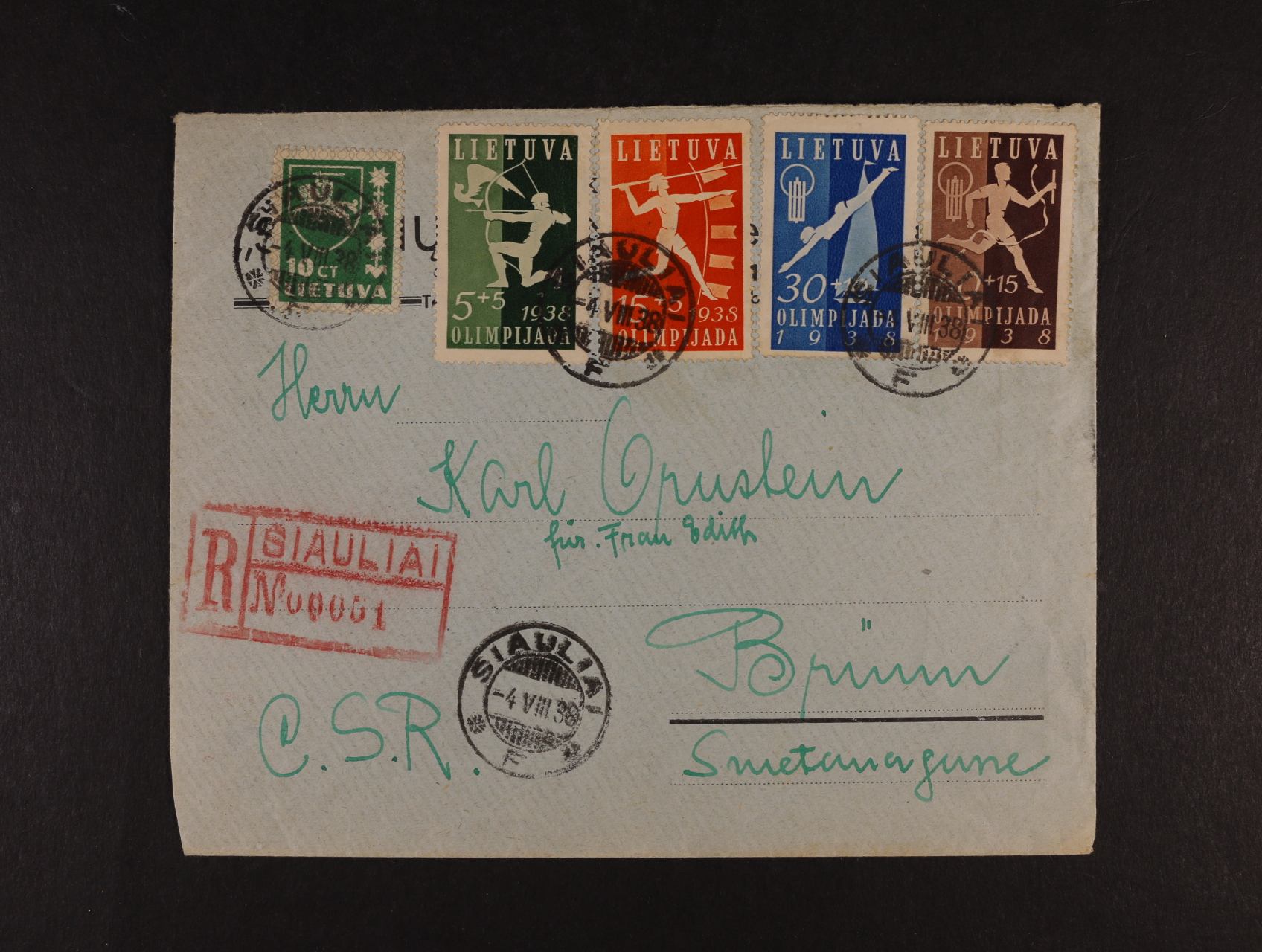 1023 R-dopis do Brna frank. mj. zn. Mi. č. 417 - 20, pod. raz. SIAULIA 4.8.38 400