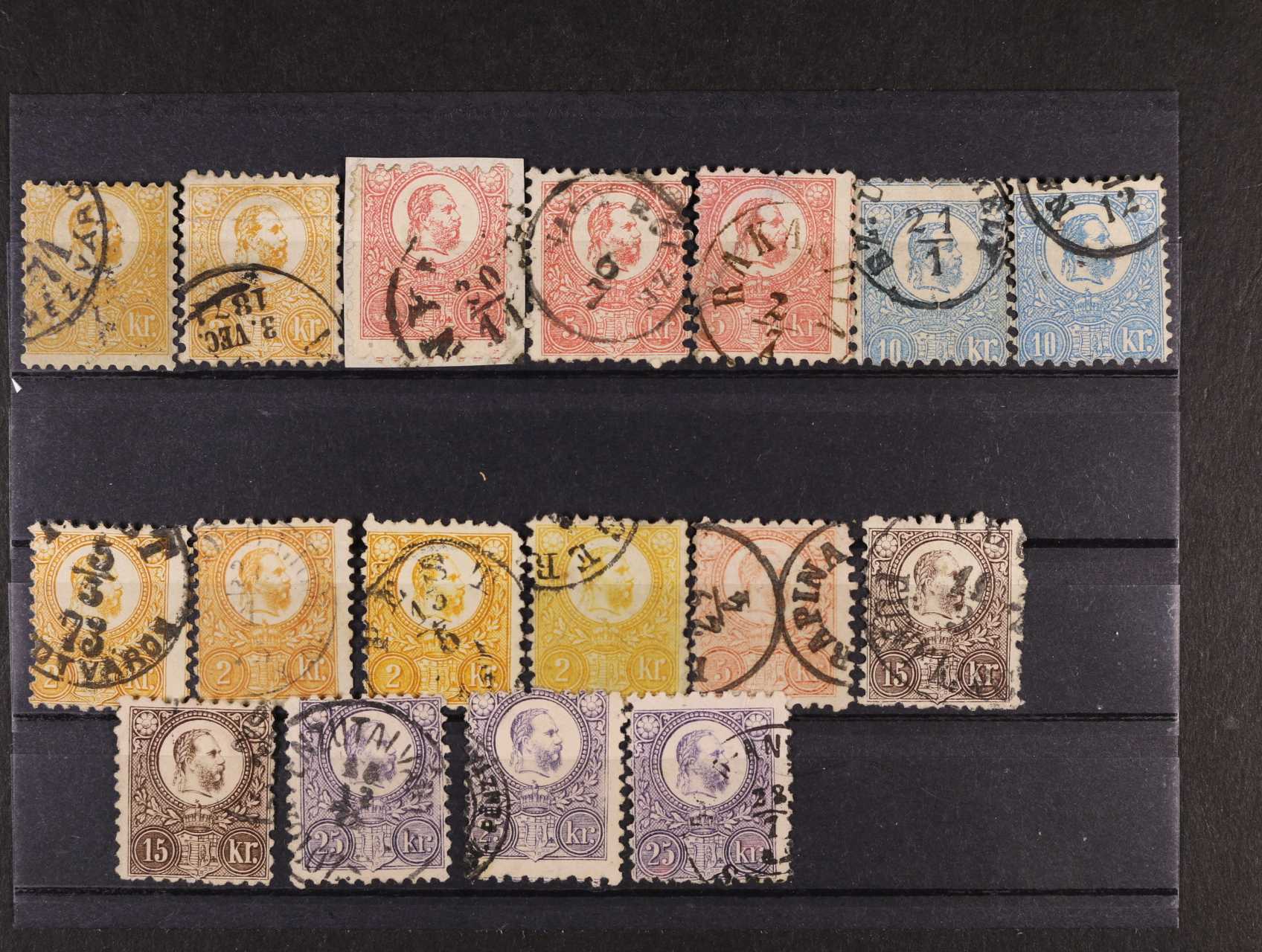 1027 eseje nevydaných zn. podle návrhů Sigmunda Friedla z r. 1872 nepřijaté maďarskou poštou, vytištěné v Schögelmühl, sestava 8 ks - 1kr. v barvě červené, 2kr. v barvě žluté, 3kr. v barvě zelené, 3kr. v barvě zelené, 5kr. v barvě červené a 15kr. v barvě šedočerné na kouscích slabého papíru v aršíkové úpravě, 25kr. v barvě modré a 50kr. v barvě hnědé na kouscích karton. papíru, zajímavé, vzácné 5000