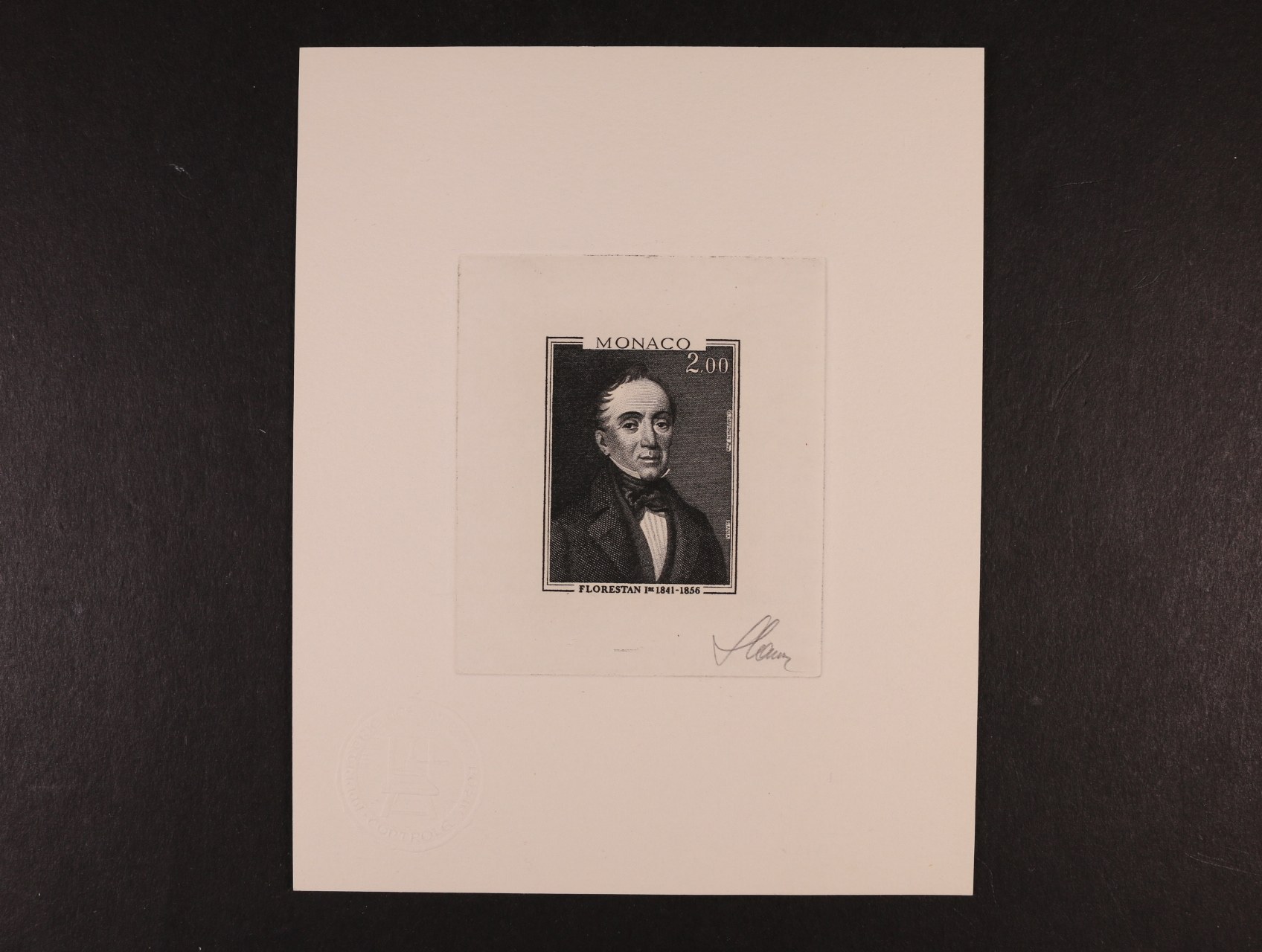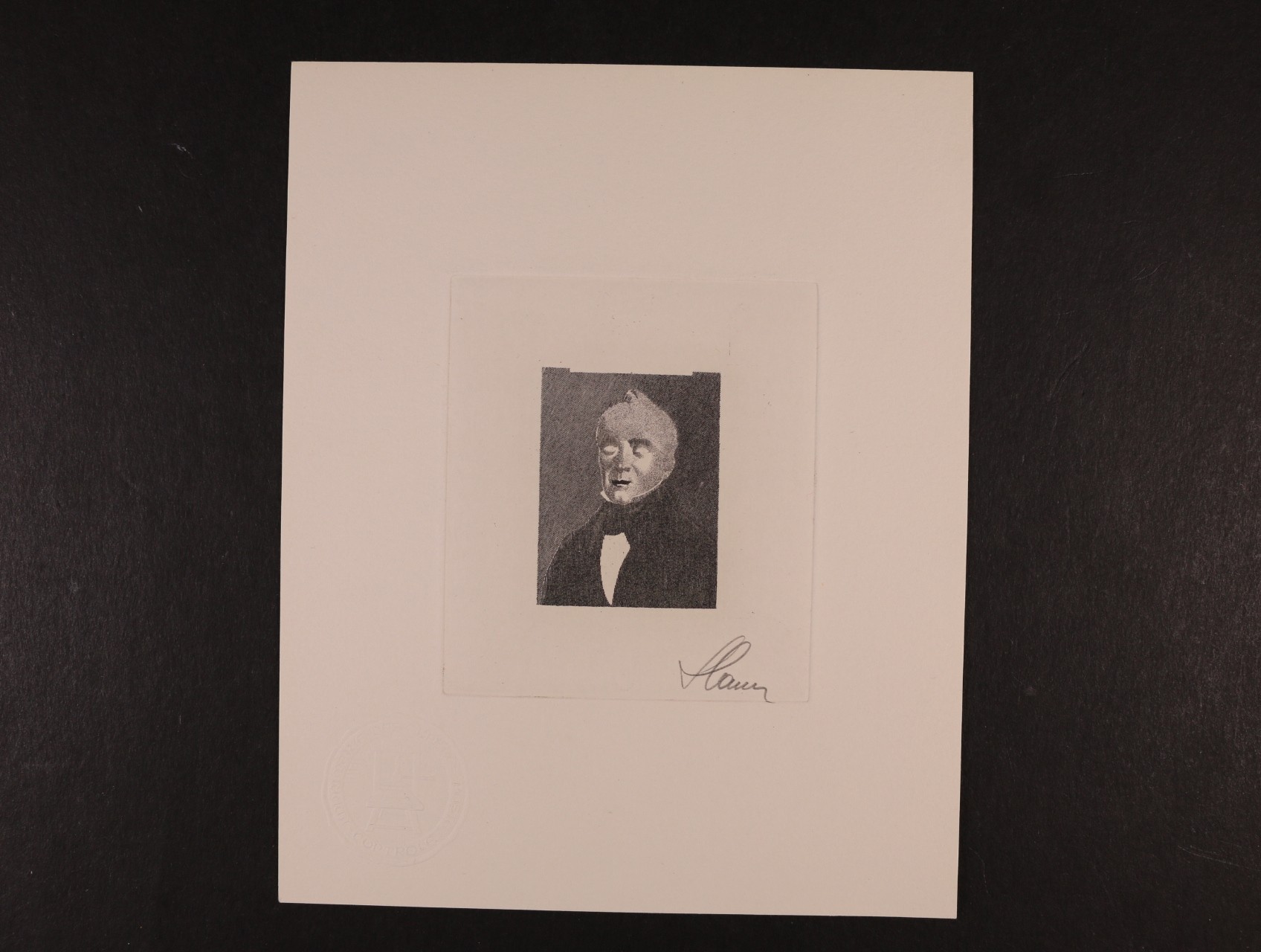 1031 zrcadlový otisk orig. rytiny zn. Mi. č. 1356 v aršíkové úpravě na kousku karton. papíru s podpisem autora Slania 800