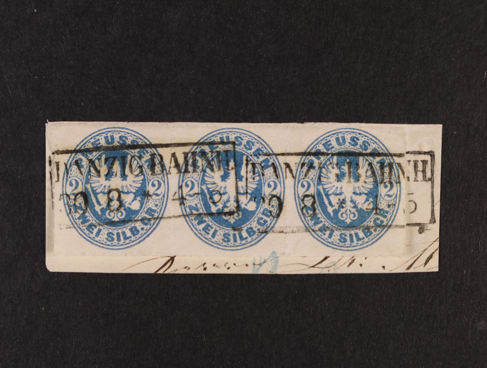 Prusko 1862 - zn. Mi. č. 17b, znak 2Sgr "pruská modrá", 3-páska na výstřižku s rámeč. raz. DANZIG BAHNH 30.8.; kat. 500 EUR + cca 25%