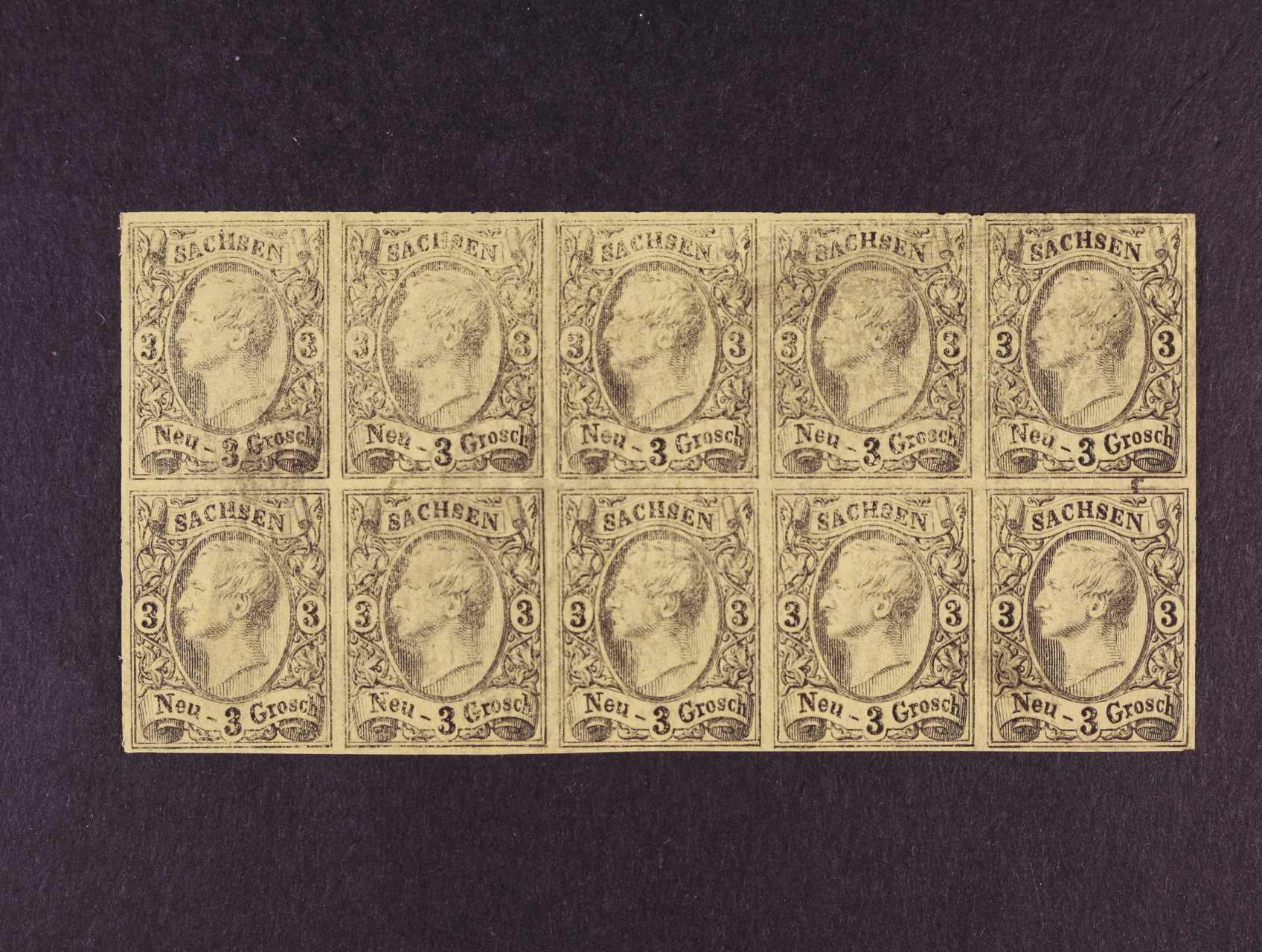 Sachsen - zn. Mi. č. 11, Johann I. 3Ngr, žlutá / černá, 10-blok jako kompletní přepážkový arch, ZT z tzv. Kontrolbogen