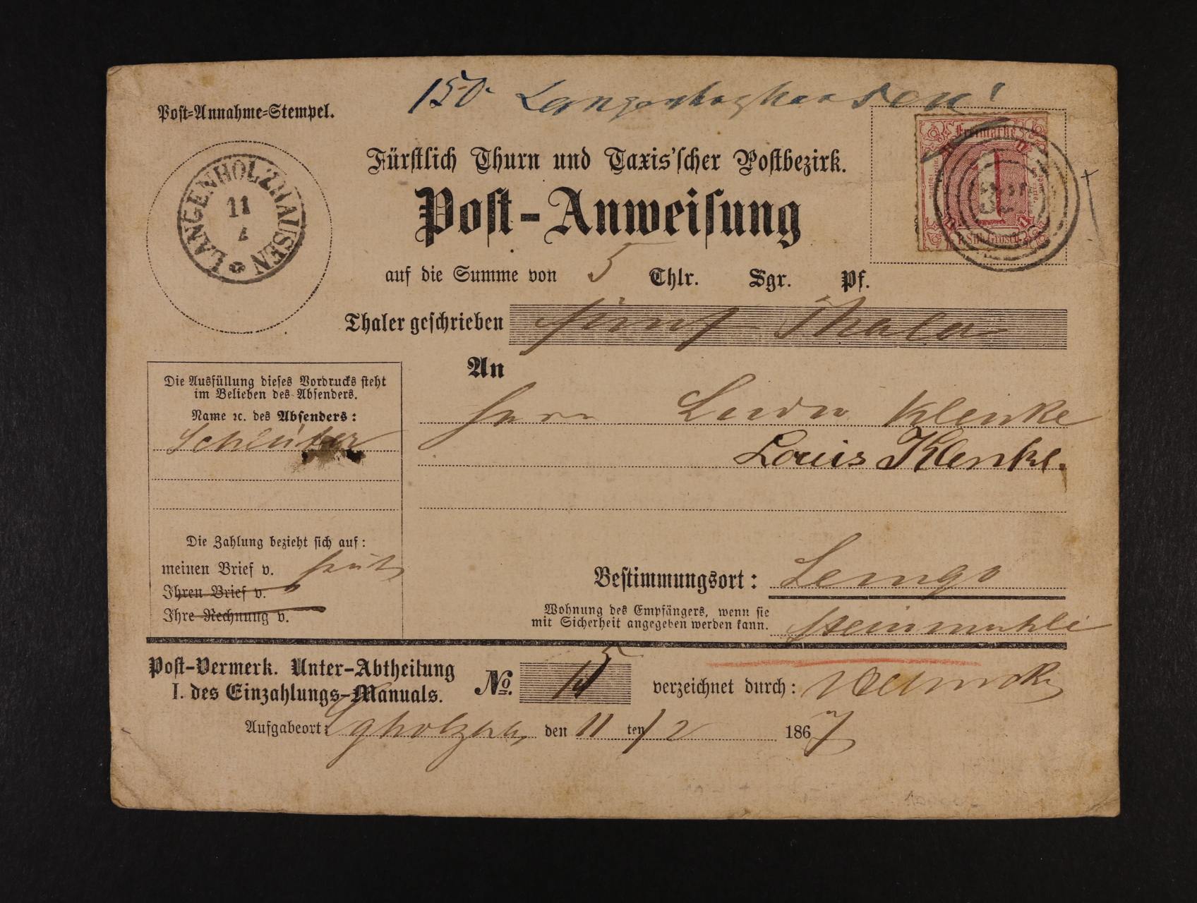 Thurn-Taxis - kompl. průvodka frank. zn. Mi. č. 48, znehodnoc. čís. raz. 324 + denní raz. LANGENHOLZHAUSEN 11.4., ruční datace v textu 1867