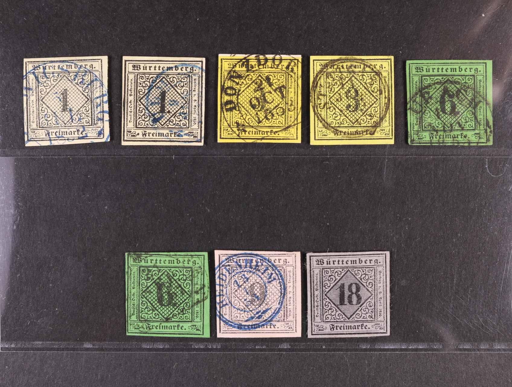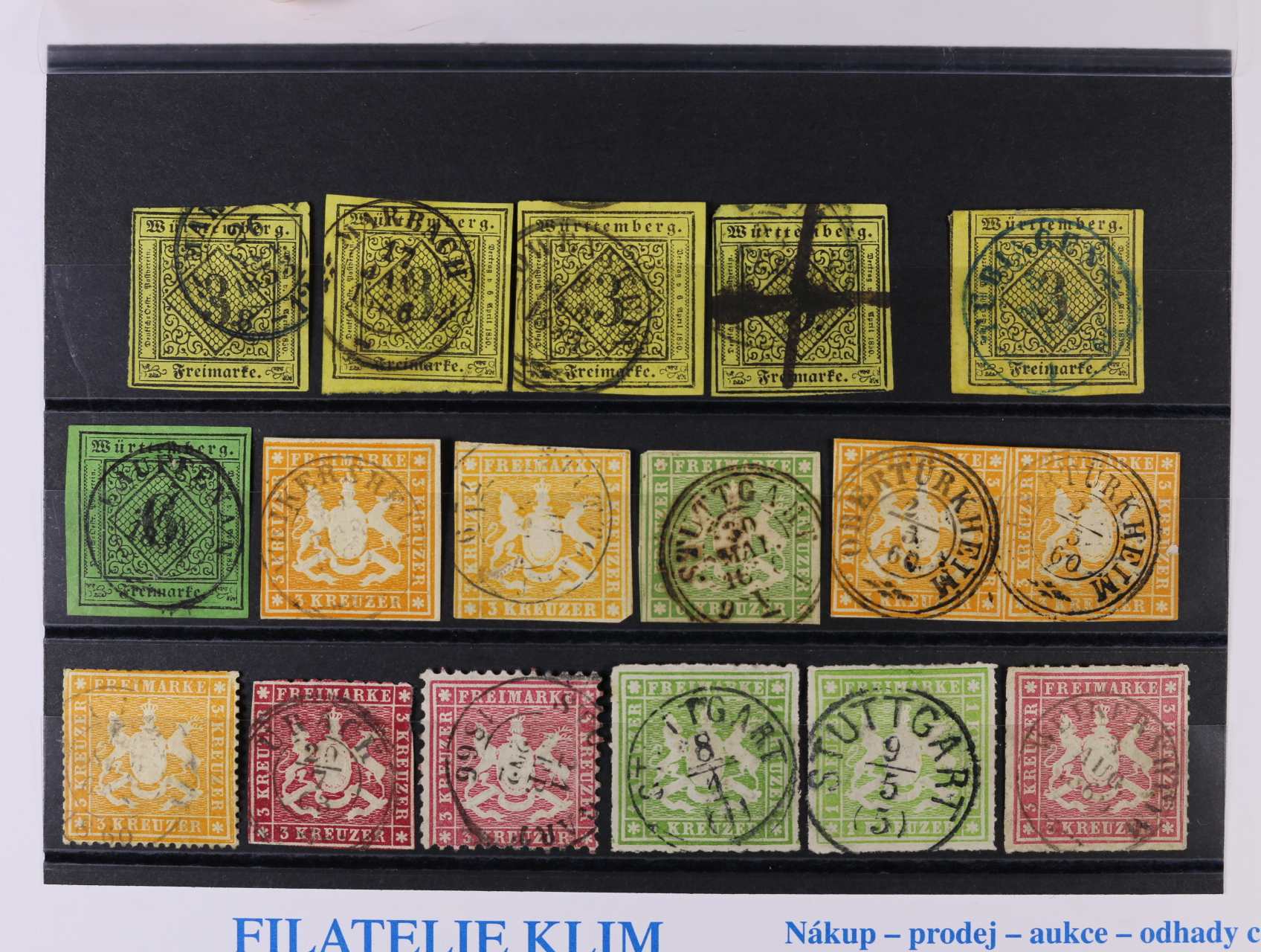 Württemberg - sestava 15 ks zn. + jedna dvoupáska, zn. Mi. č. 2 5x, Mi. 3, 12, 13, zajímavé, dobrá kvalita, min. 400 EUR