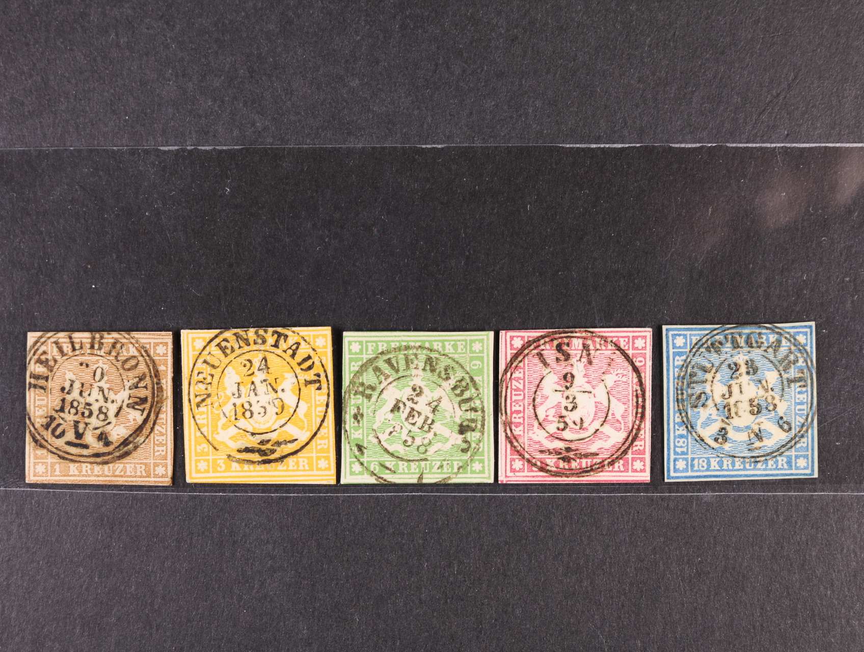 Württemberg - zn. Mi. č. 1 - 5 (č. 1 - 3 2x - bar. odstíny), zn. č. 5 typ I, nepoužitá, bez lepu, velmi vzácná, zk. Richter, atest Georg Bühler, velmi dobrá kvalita, vybraná raz., 2140 EUR