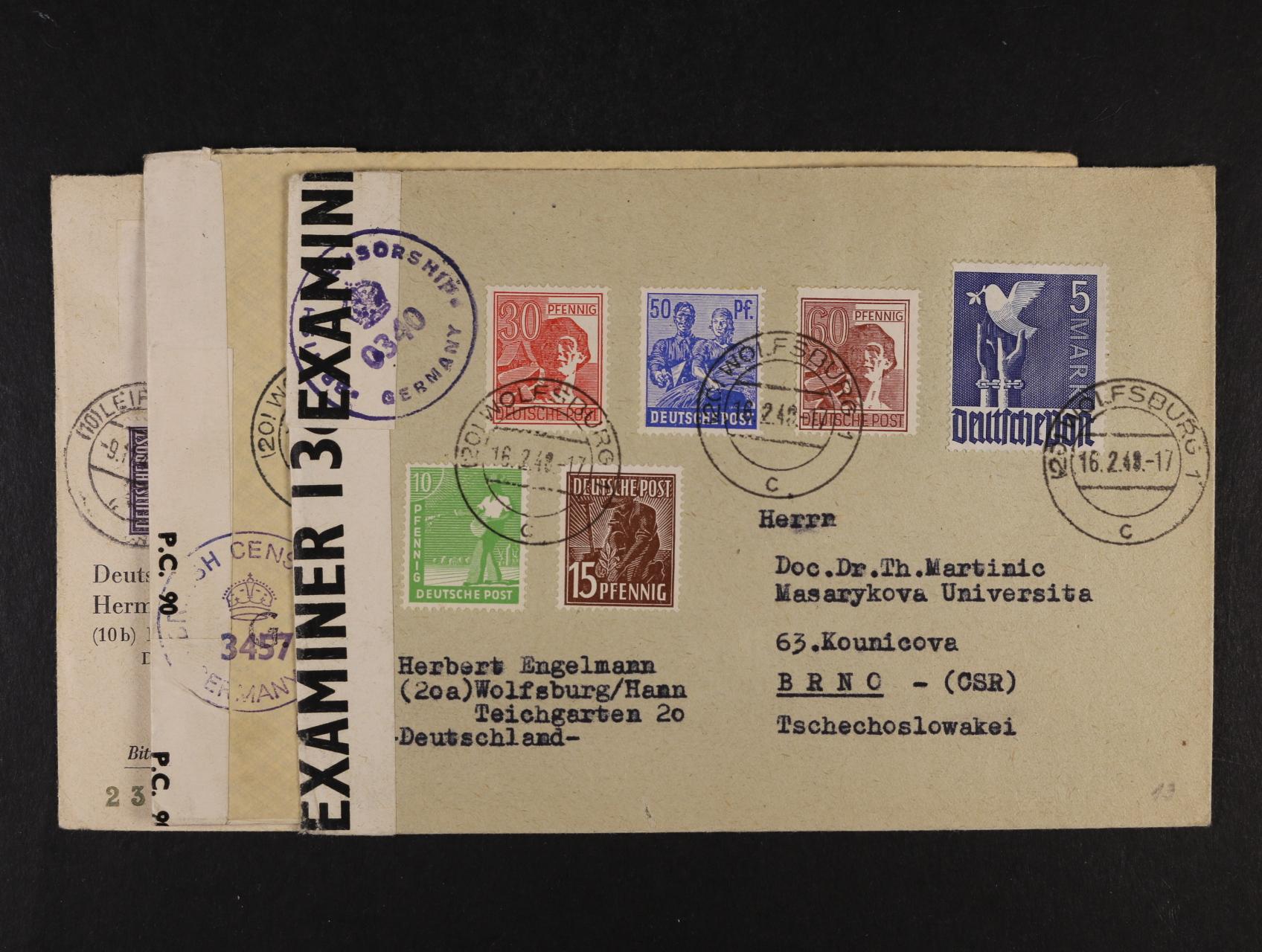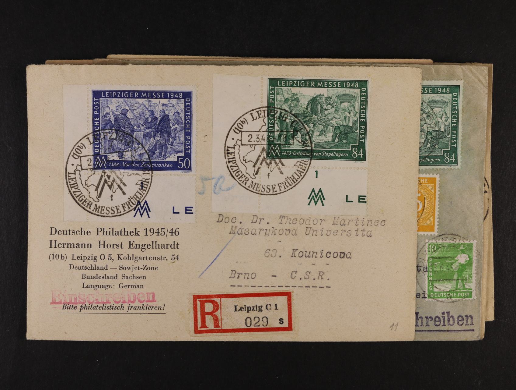 Spol. vydání Sovětská zóna - sestava 11 ks převážně R-dopisů do Brna z let 1947 - 8, frank. mj. zn. Mi. č. 198 - 9, 240 - 41, velmi dobrá kvalita, zajímavé frankatury a raz.
