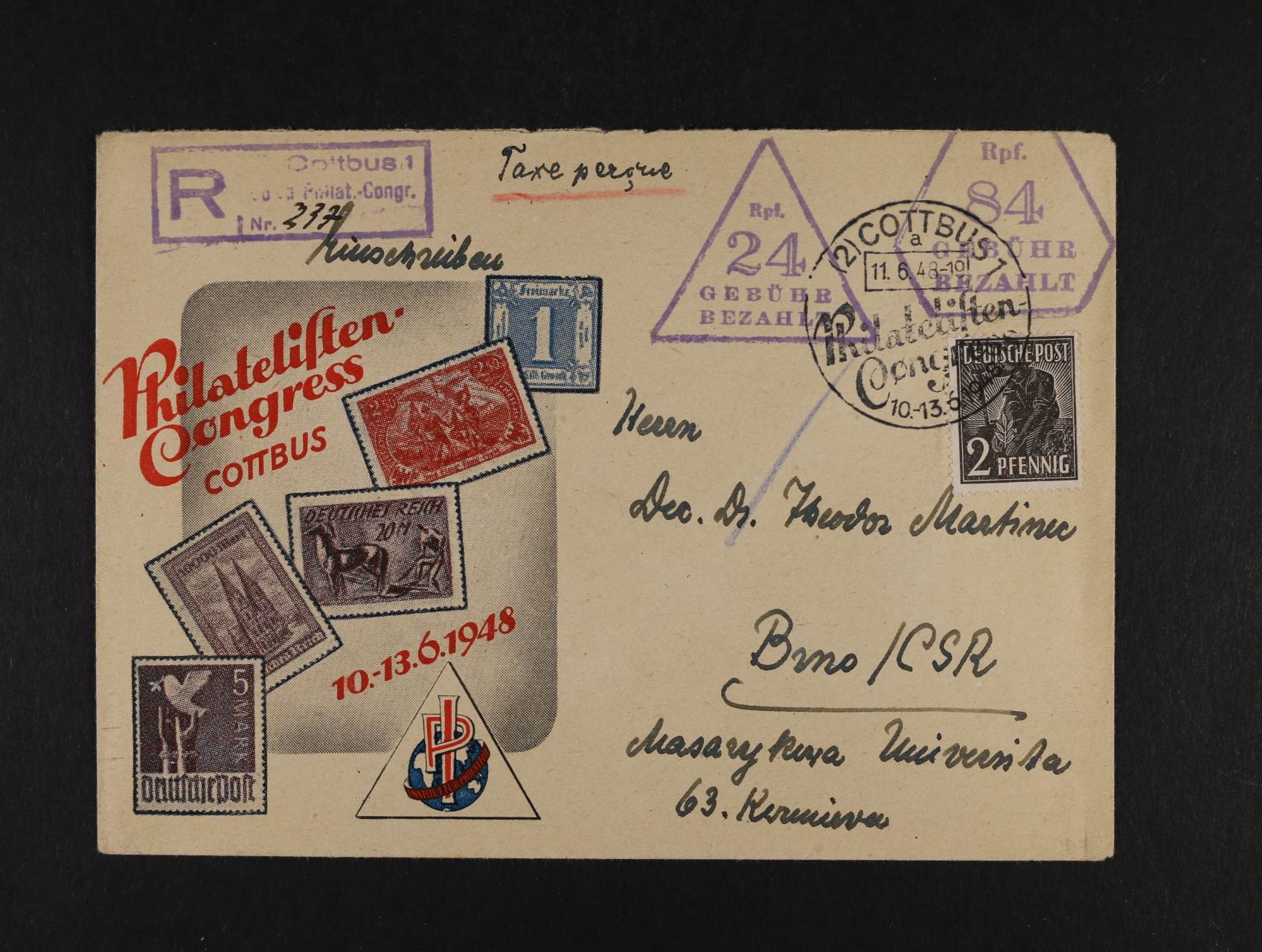 Spol. vydání Sovětská zóna - R-dopis do Brna frank. zn. Mi. č. 943 + dvě raz. ZAPLACENO V HOTOVOSTI 24, resp. 84Rpf., pod. raz. COTTBUS 11.6.48 Philatelisten Congress, zajímavé