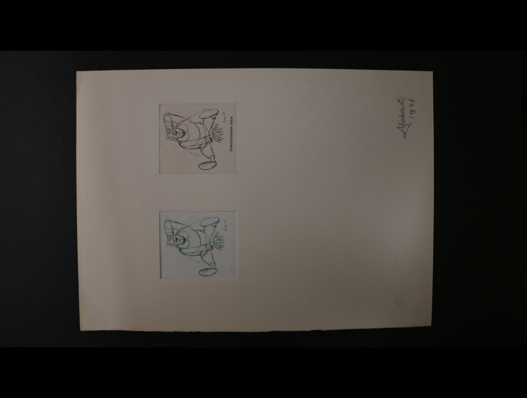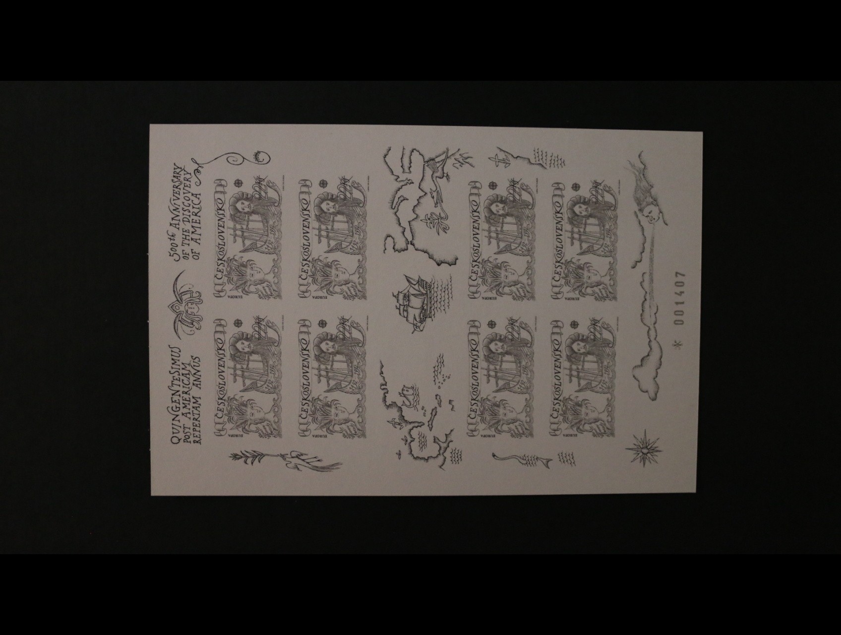 II. Celostátní výstava poštovních známek PLZEŇ 1959 - knihtiskový soutisk zn. č. 1050 - 1053 ve zvétšeném formátu v barvé modré, na papíře form. A4, který mněl být použit jako upomínkový dárkový tisk pro funkcionáře a hosty výstavy