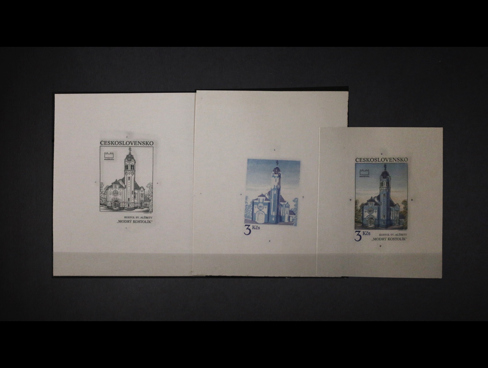 otisk orig. rytiny zn. č. 2989 - kompl. soutisk v orig. barvách + dva fázové otisky na kouscích karton. papíru, zajímavé