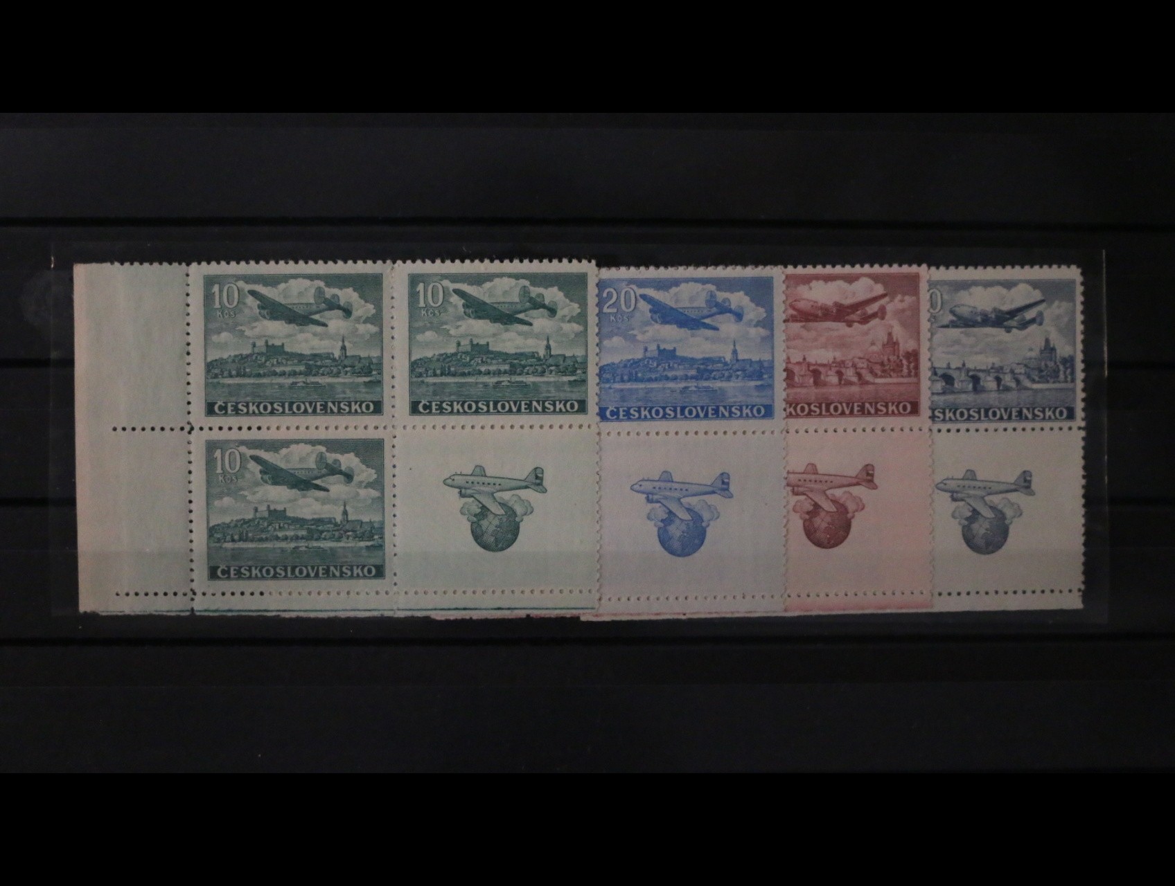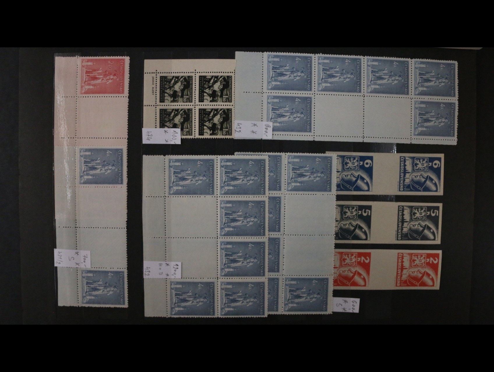 sestava nevydaných zn. k 5tému výr. SNP, kompl. série čtyř hodnot 5, 10, 20 a 50 Kčs v celých PL po 30ti zn., (hodnota 5, 20 a 50Kčs 2x, hodnota 10 Kčs v PL o 60ti známkách, uprostřed s meziarším a různě posunutou perforací), některé PL s drobnými lomy