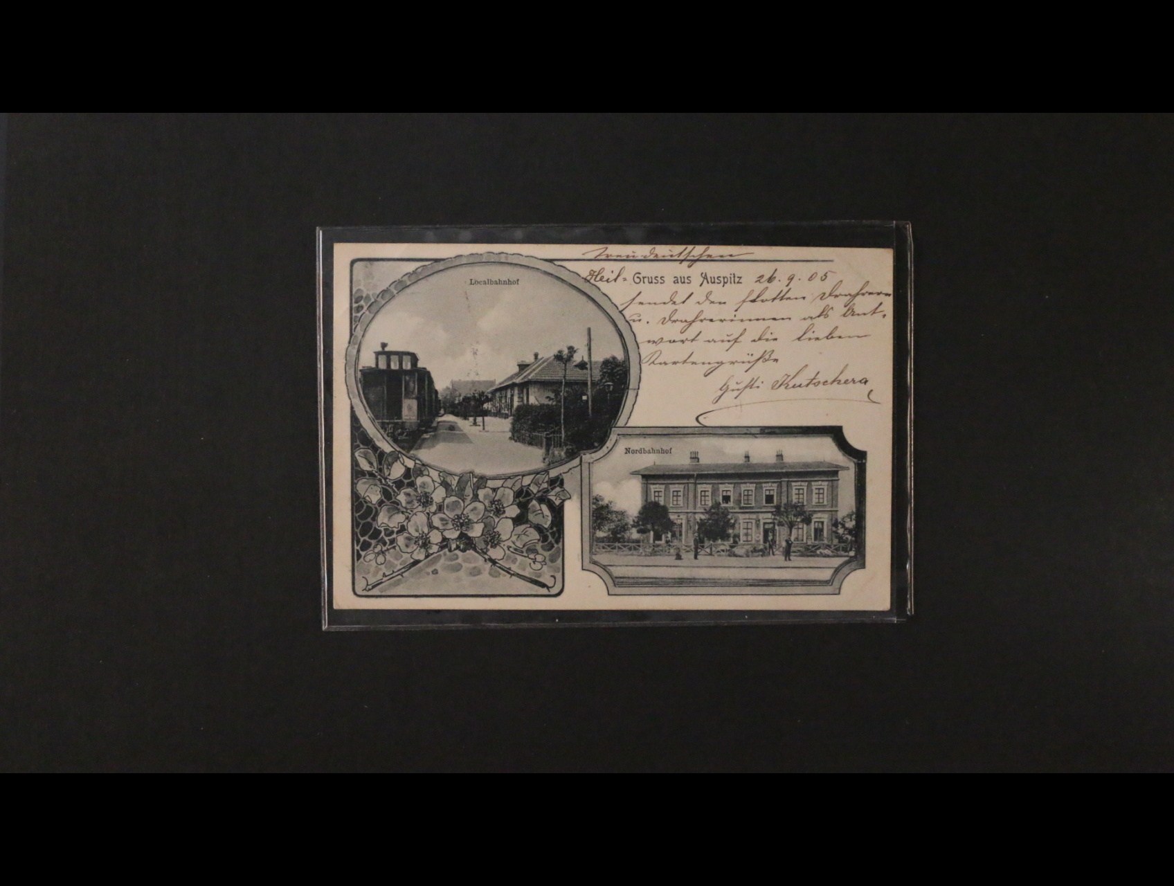 Hustopeče Gruss aus Auspitz - jednobar. litograf. koláž, dl. adresa, použitá 1905, dobrá kvalita