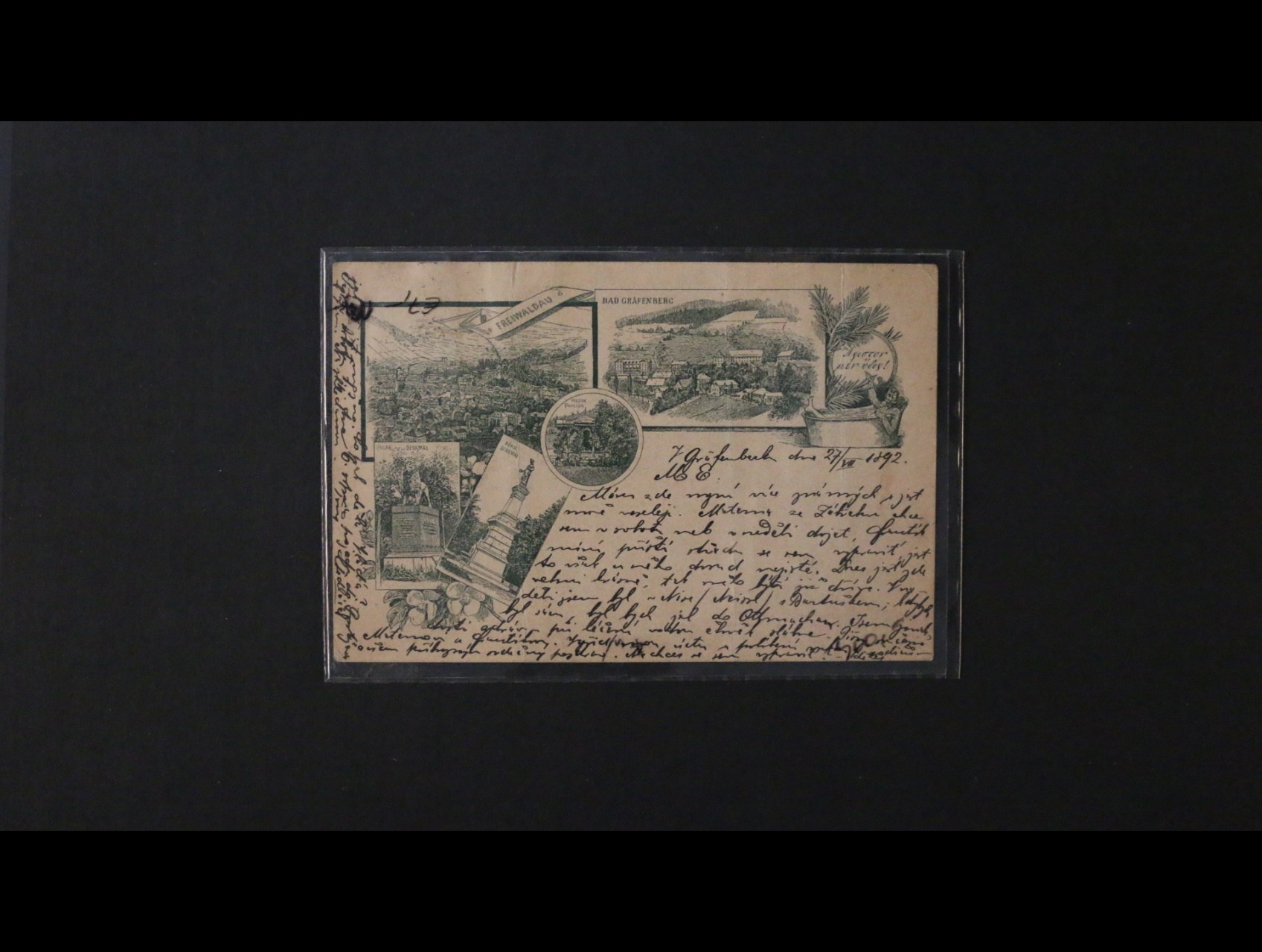 Jeseník - Freiwaldau - jednobar. litograf. koláž, dl. adresa, použitá 1892 !, na třech místech svislé lomy, velmi zajímavé