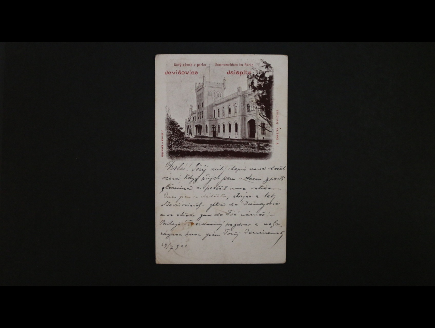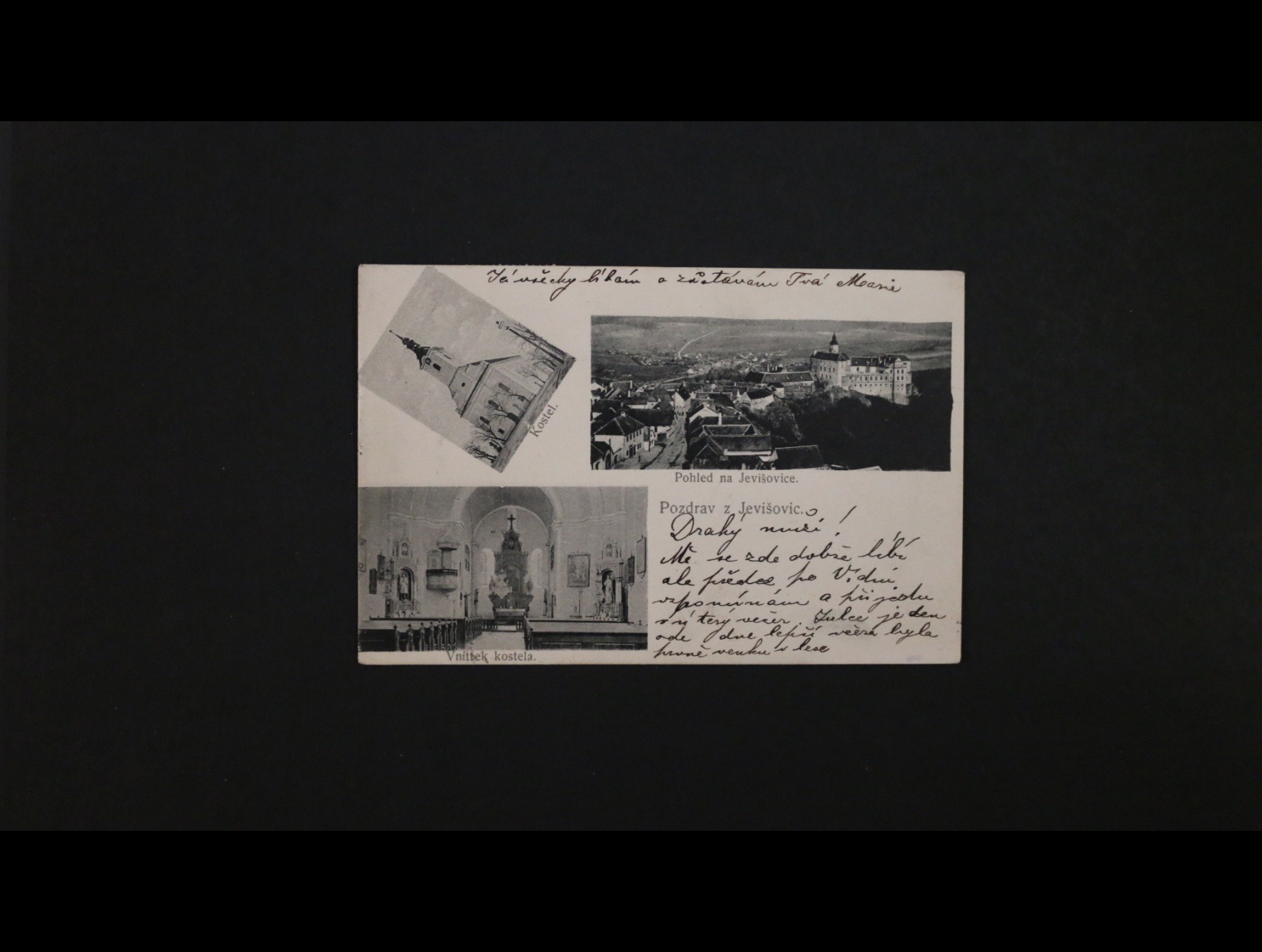 Jevišovice - sestava 5 ks jednobar. litografií, 2x dl. adresa, použité, zajímavé