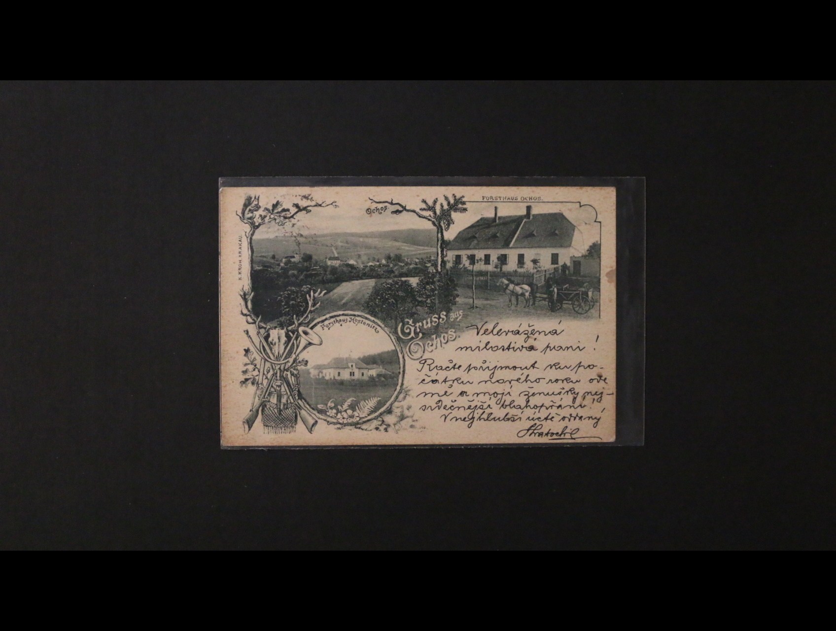 Ochoz u Brna - Gruss aus Ochos - jednobar. litograf. koláž, dl. adresa, použitá 1899,