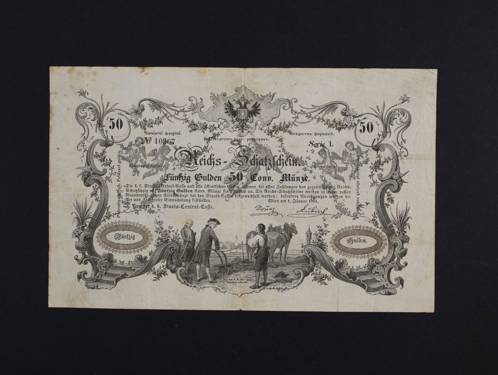 50 Gulden 1.1.1851 série I. tzv. "oráč" (motiv Josefa II. orajícího na poli u Slavíkovic), velmi vzácný, Ri. 114, Pi. A137a