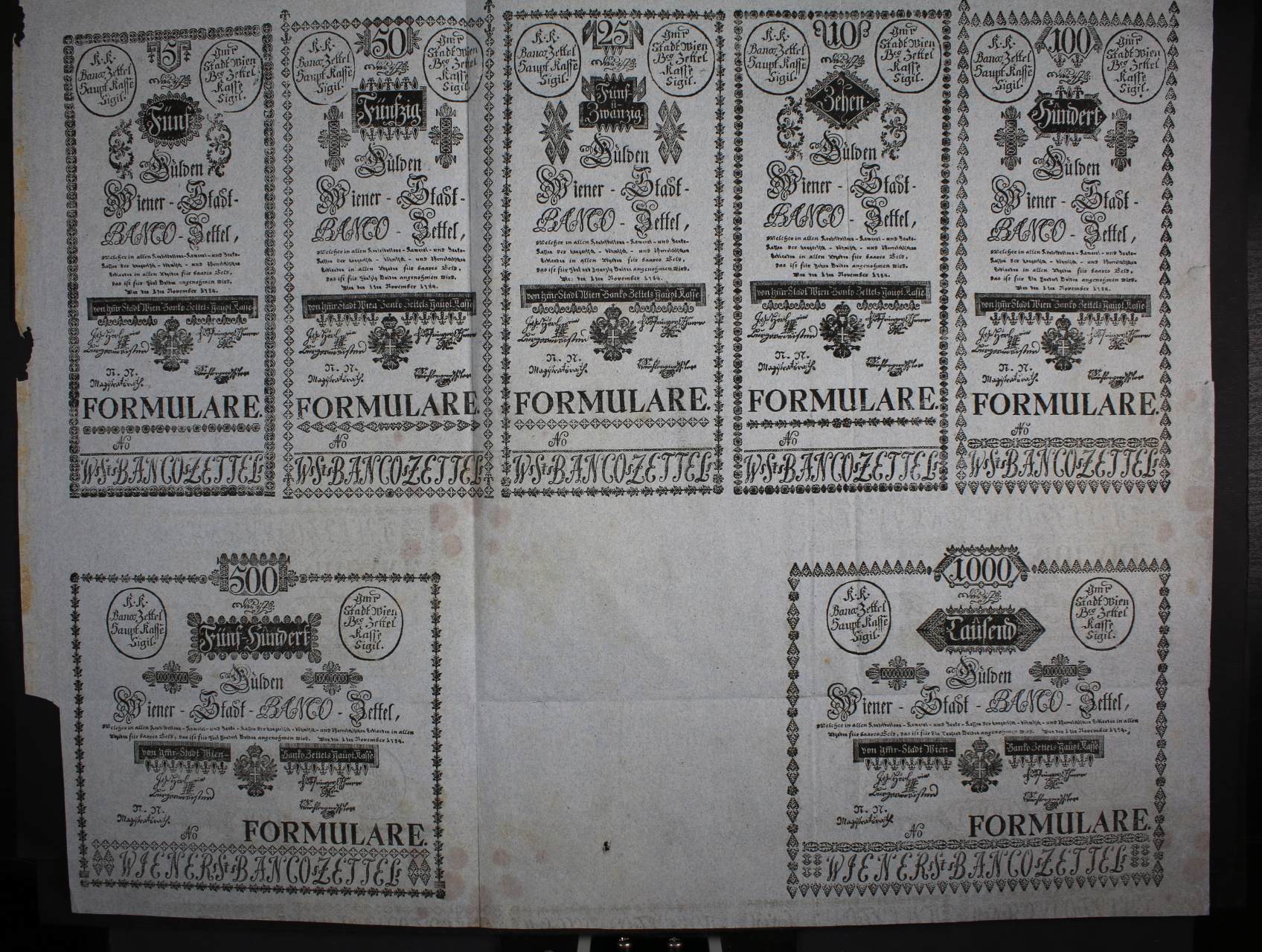 678 5, 10, 25, 50, 100, 500, 1000 Gulden 1.11.1784 formuláře na jednom archu bez patentu, Ri. 16 - 22 Fa 10000
