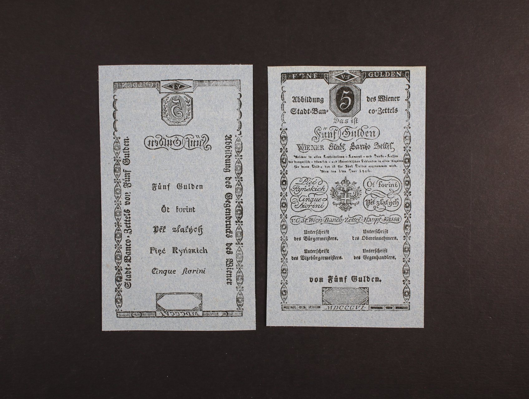 680 5 Gulden 1.6.1806 jednostranné formuláře, líc a rub zvlášt, Ri. 39 Ff, 2 kusy 1200