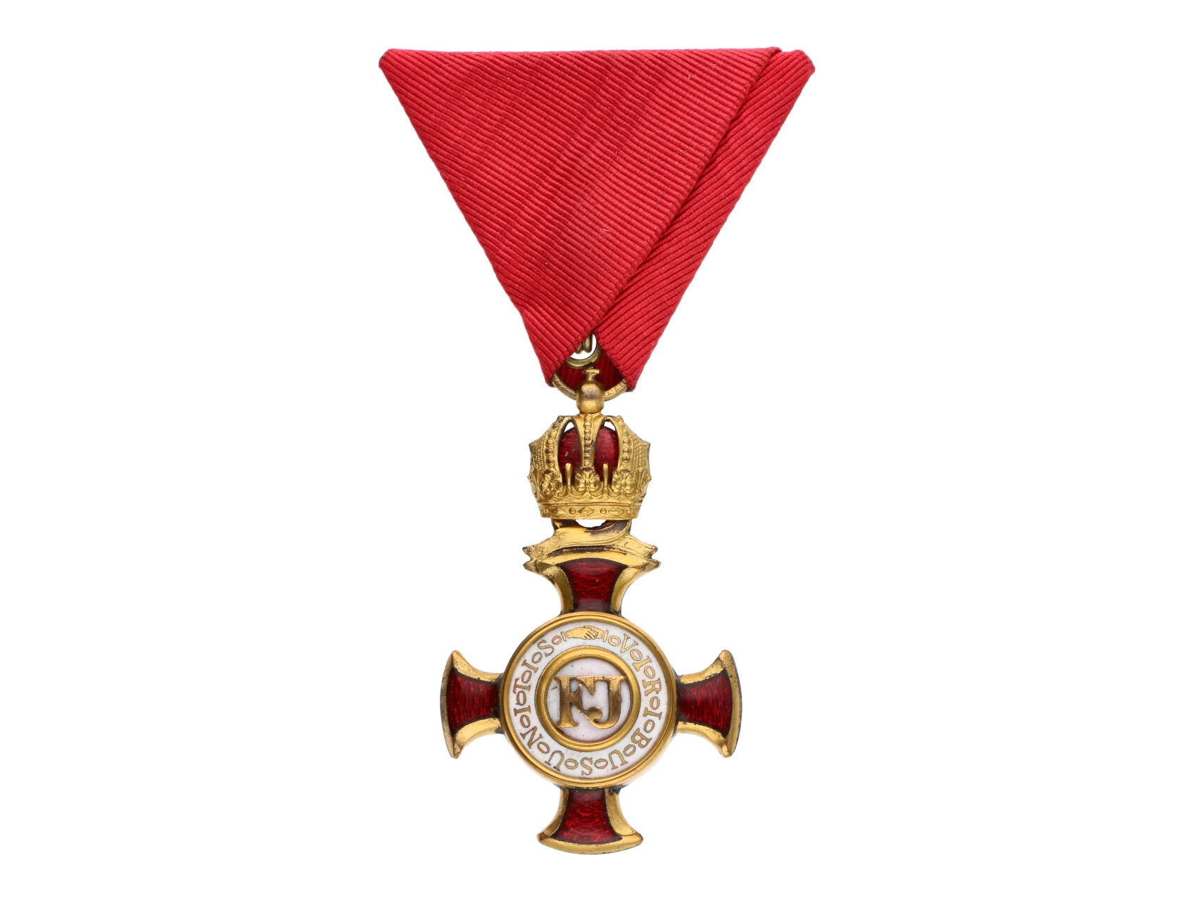 Zlatý Záslužný kříž, na kroužku punc Au a značka výrobce F. Braun in Wien, provedení do r. 1867/75, zlato, smalty, původní civilní stuha, originální etue, Marko139a