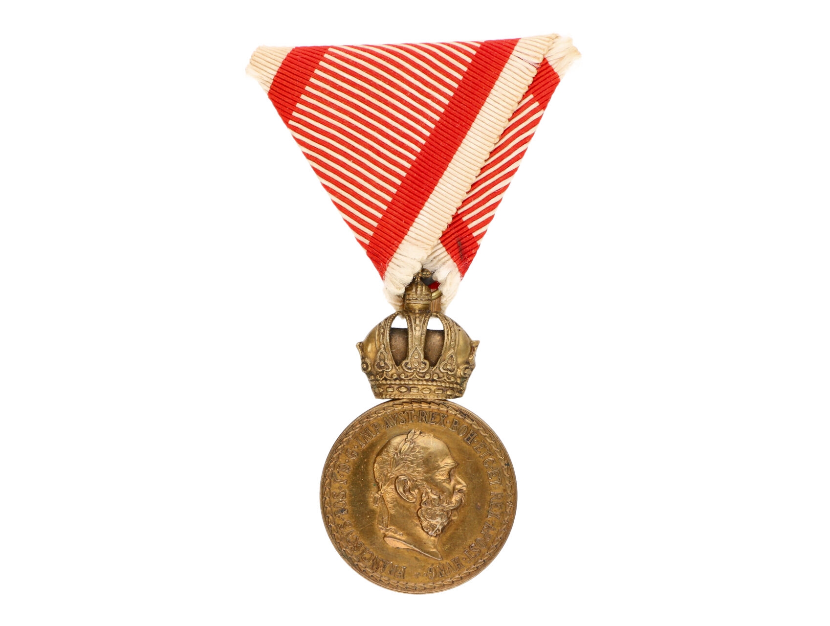 Stříbrná vojenská záslužná medaile Signum Laudis F.J.I., na hraně značka hl. punc. úřadu Vídeň "A", na závěsném kroužku punc Ag a značka výrobce JZ (Josef Zimbler), původní vojenská stuha s meči a originální etue, Marko146a