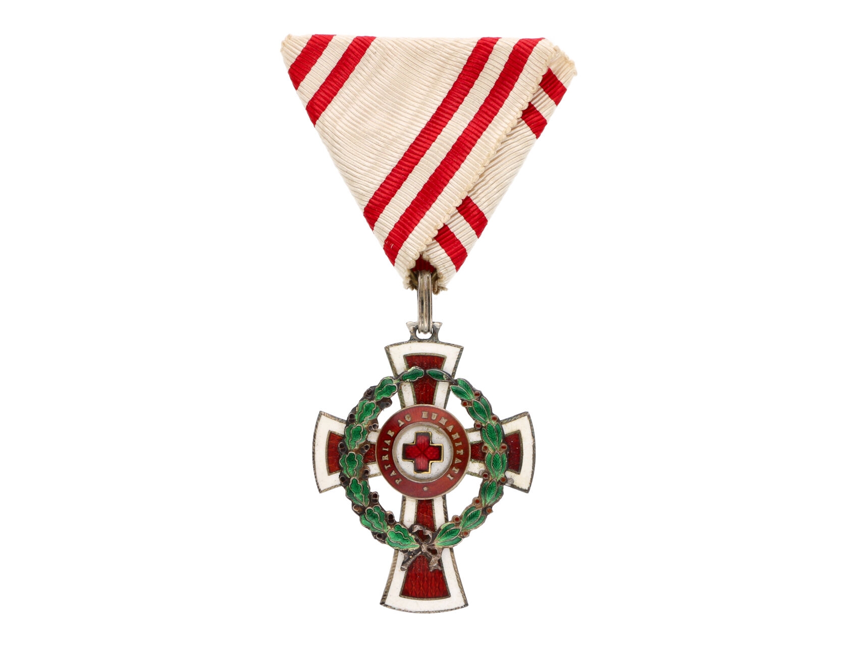 Čestné vyznamenání Za zásluhy o Červený Kříž s válečnou dekorací II. tř., na závěsném očku punc Ag a značka výrobce, (nečitelná) originální etue a dekret udělený 14. listopadu 1917, dekorativní, Marko 161a