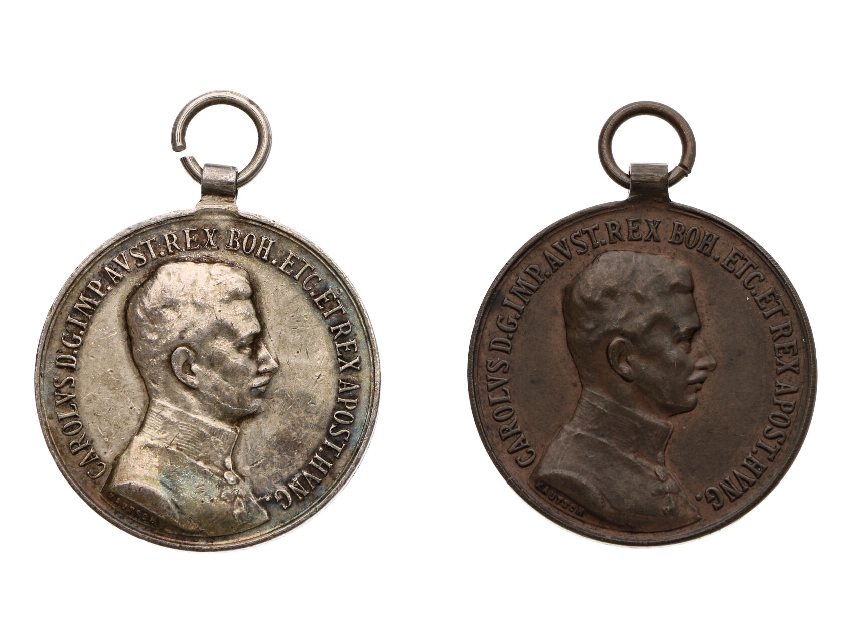 Stříbrná medaile za statečnost 2. třídy, 9. vydání 1917-1918 Karel, na hraně punc hl. puncovního úřadu Vídeň, A v kroužku, k tomu bronzová, obě bez stuhy, Marko235a, 236a