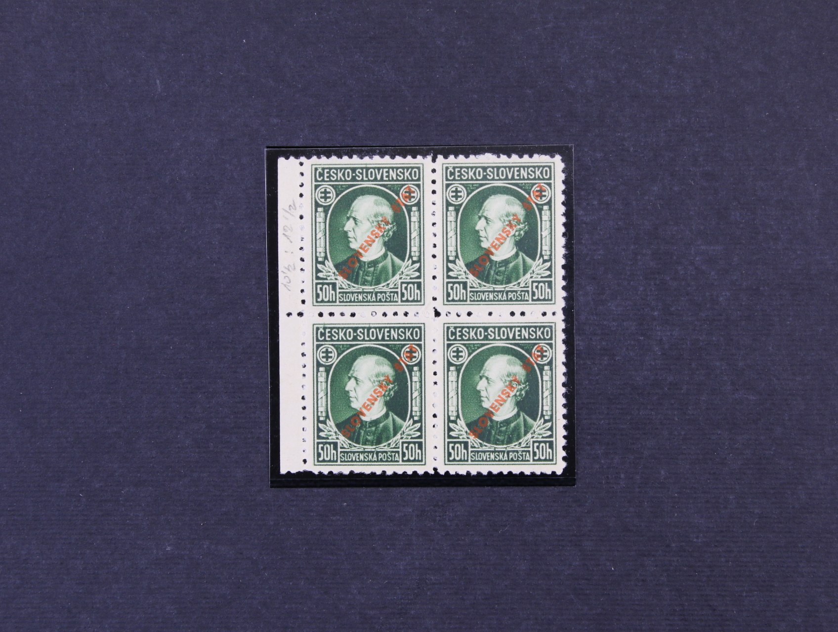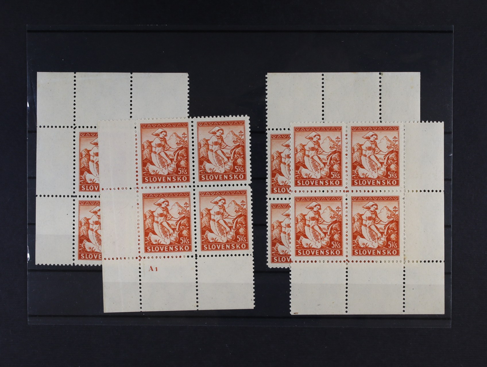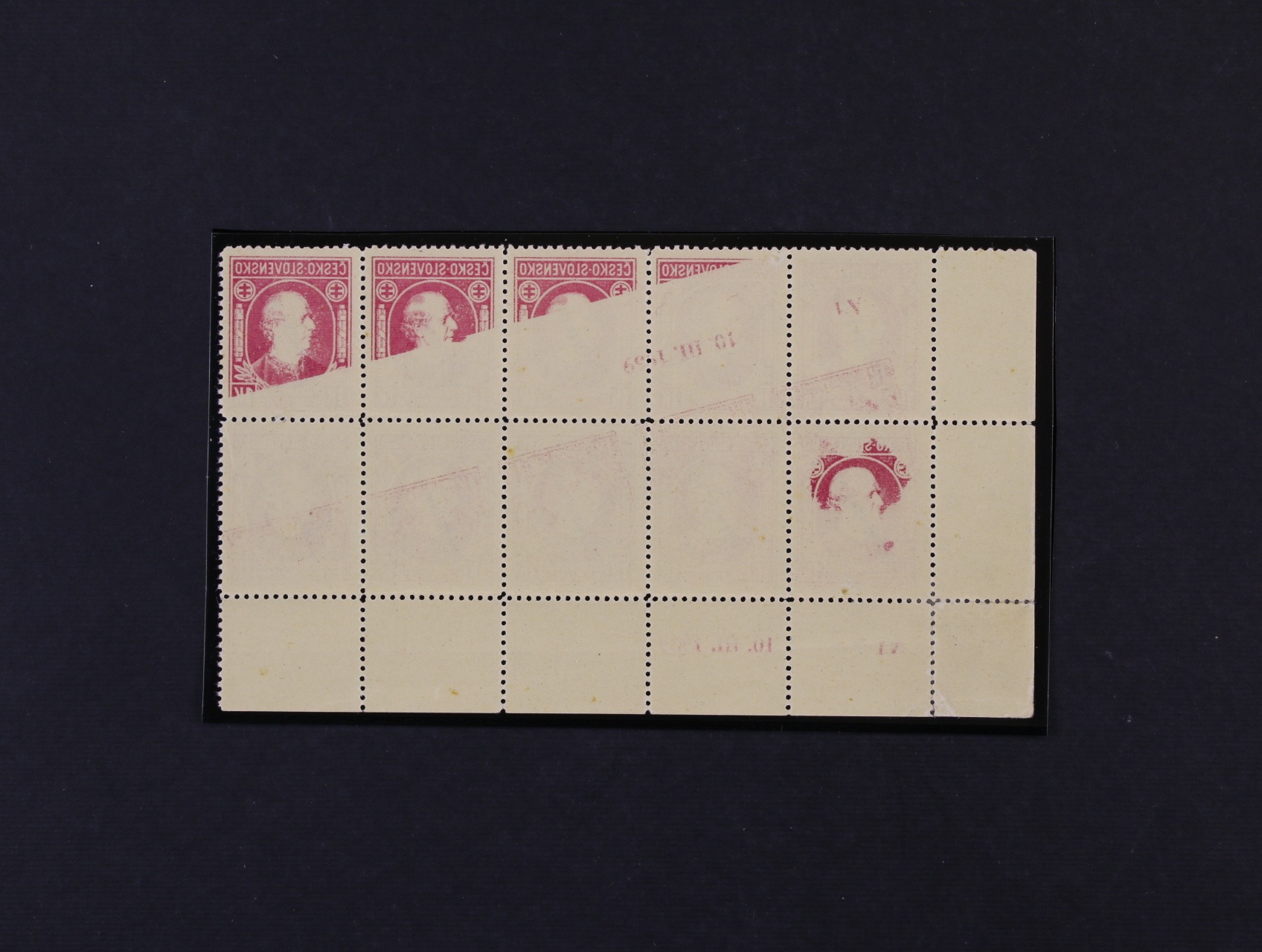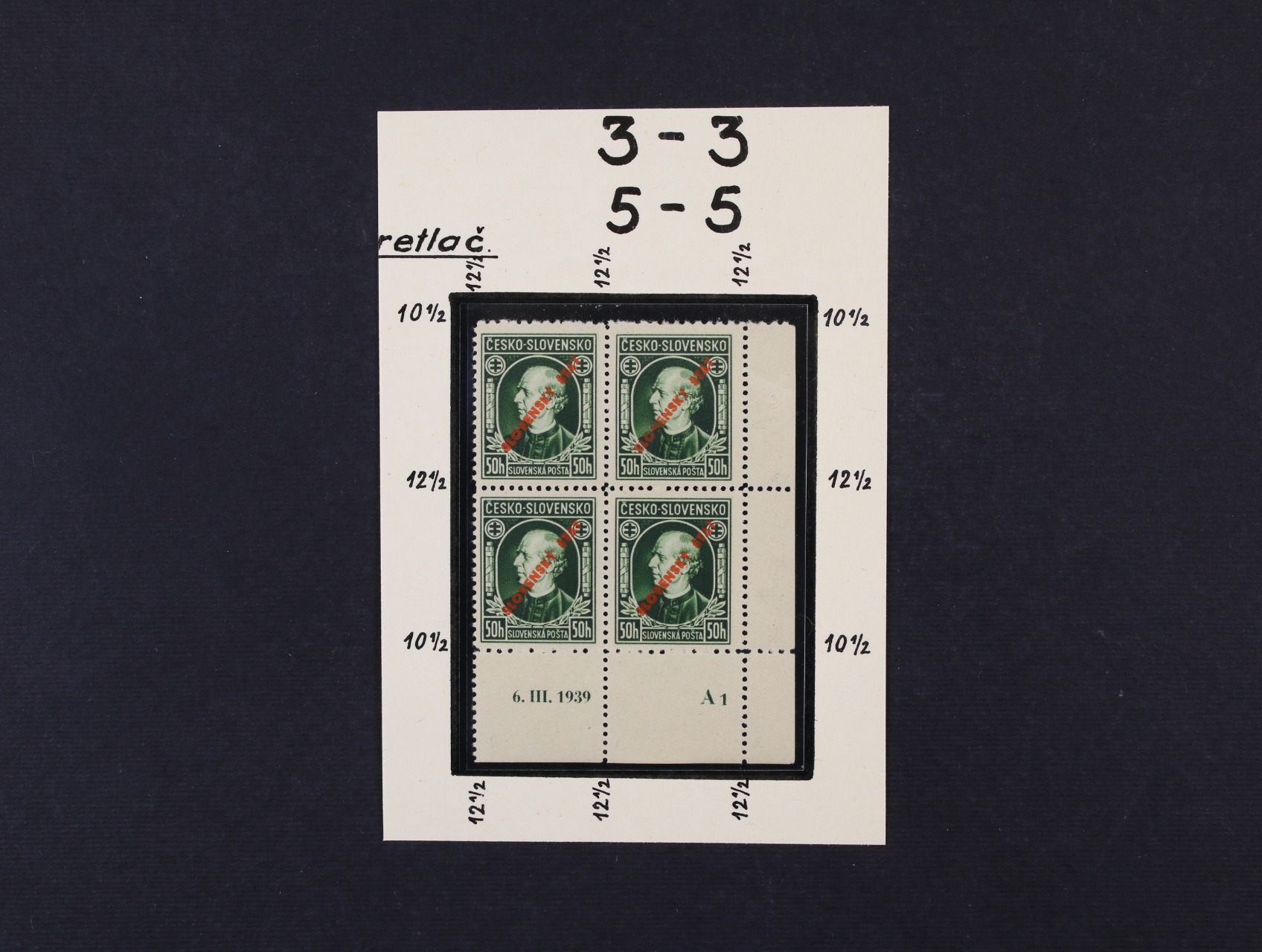 zn. č. 23 C - pravý spodní roh. čtyřblok v kombinaci 3 - 3, 5 - 5, s DZ 6.III.1939 A1, zk. Slovenský filatelista, Ptačovský, na levé horní zn. nálepka