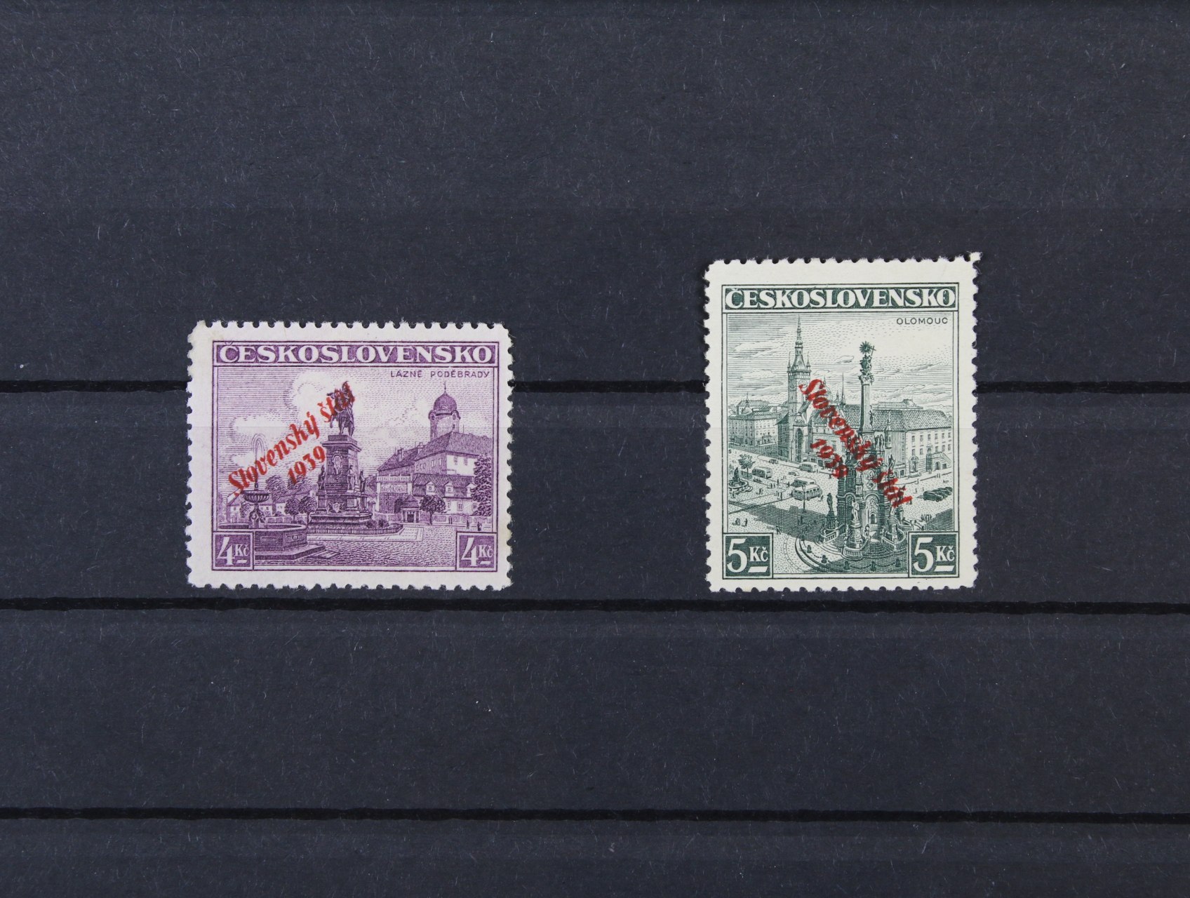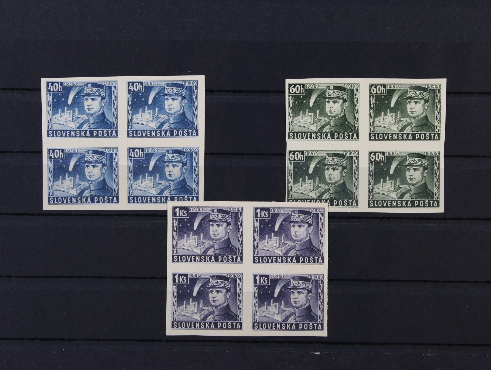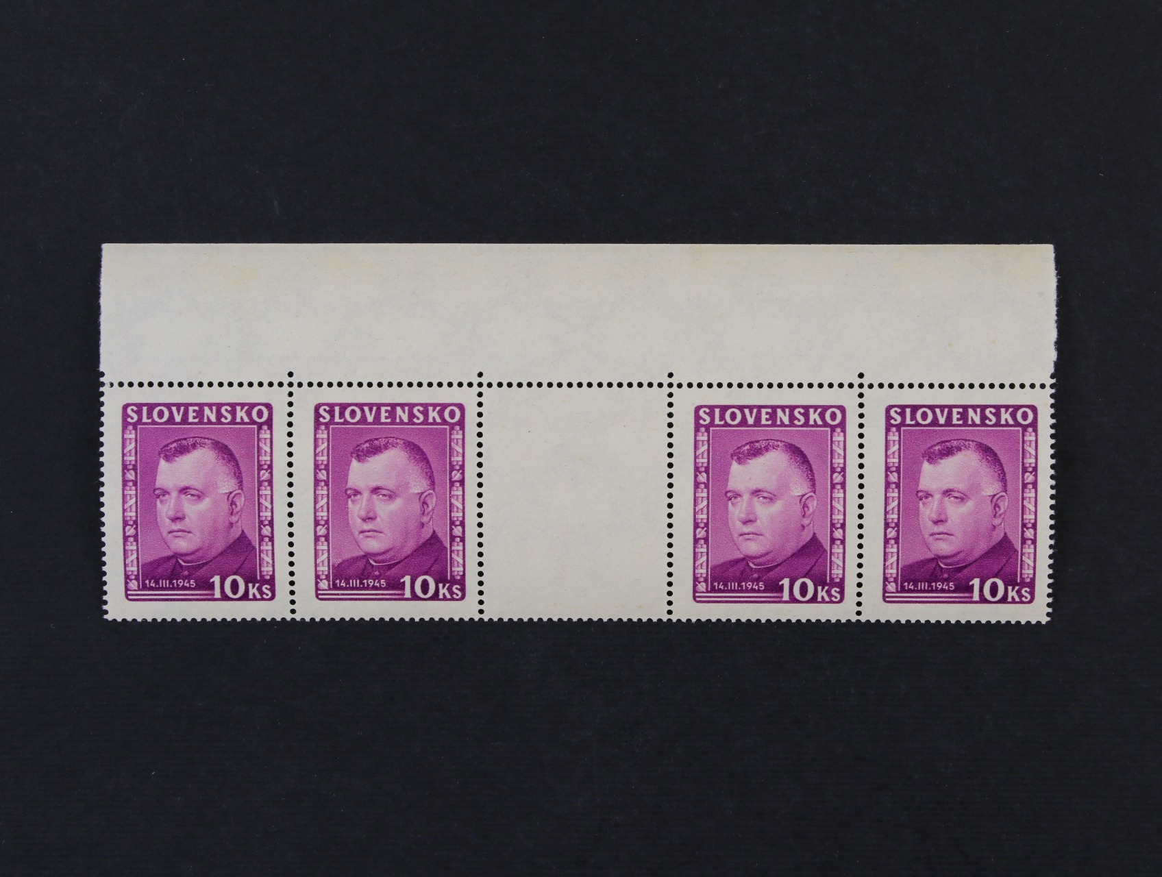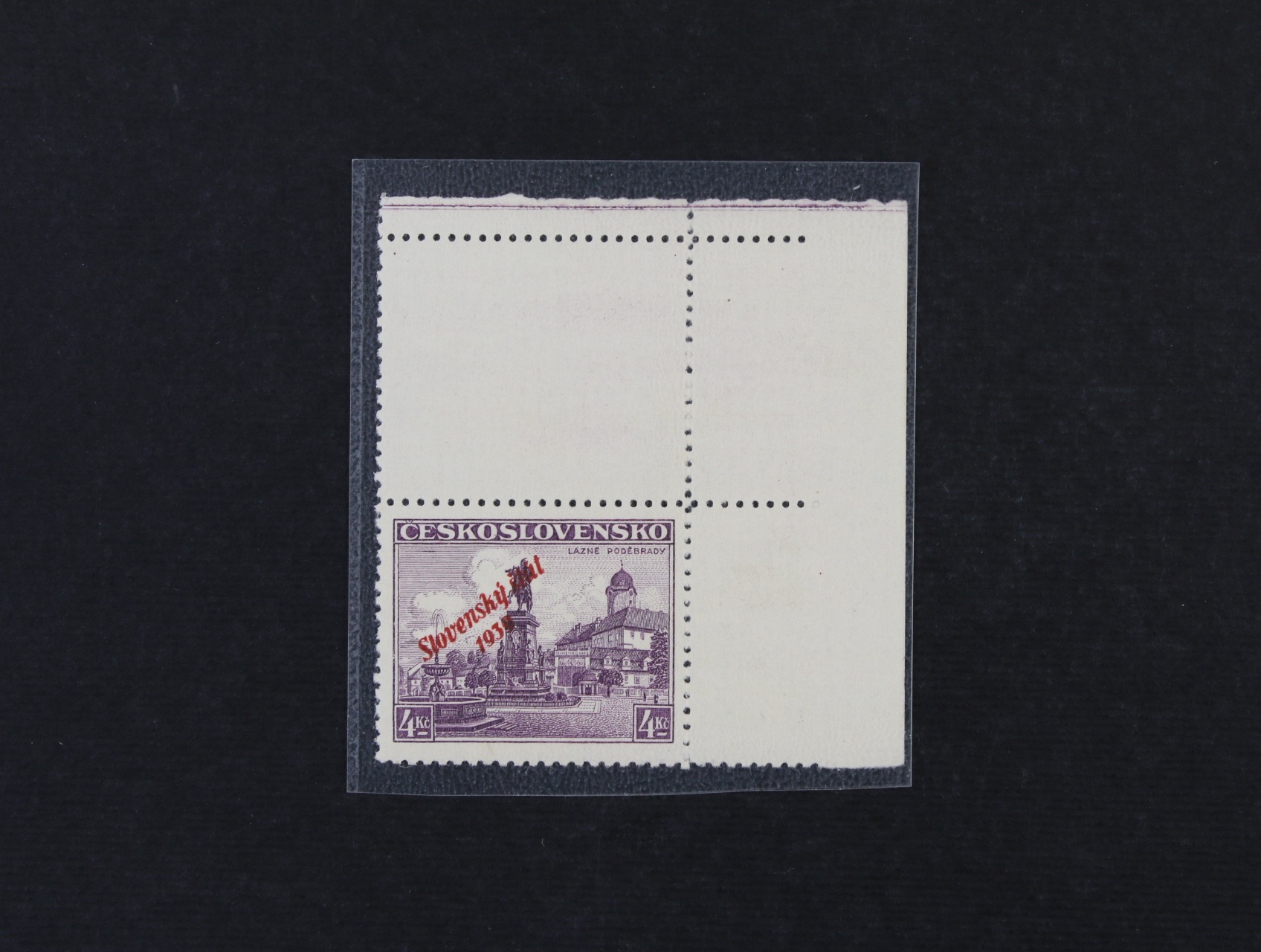 zn. č. 23 C - pravý spodní roh. čtyřblok v kombinaci 3 - 3, 5 - 5, s DZ 6.III.1939 A1, zk. Slovenský filatelista, Ptačovský, na levé horní zn. nálepka